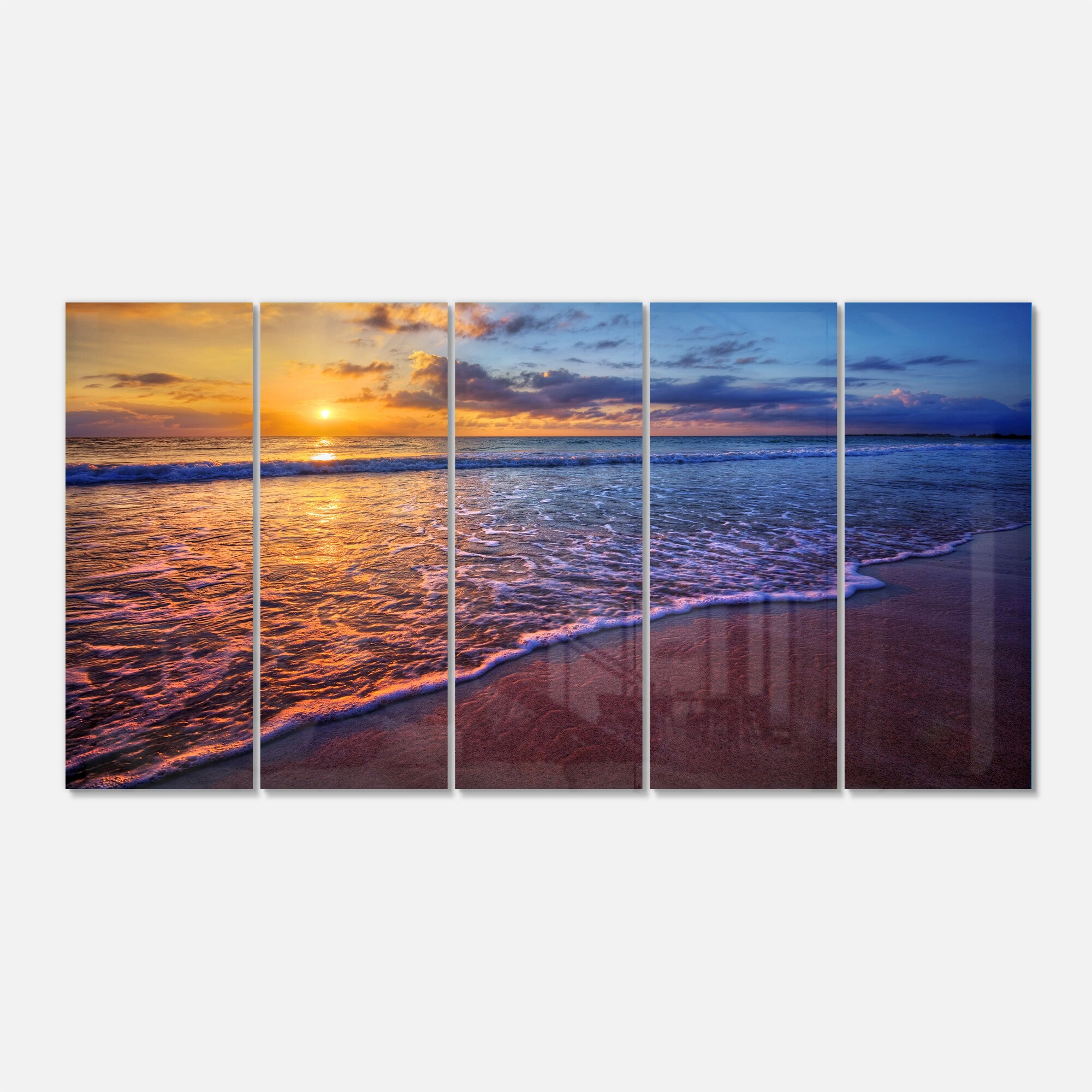 Designart 'Sunset over Blue Seashore' Seashore Glossy Metal Wall Art