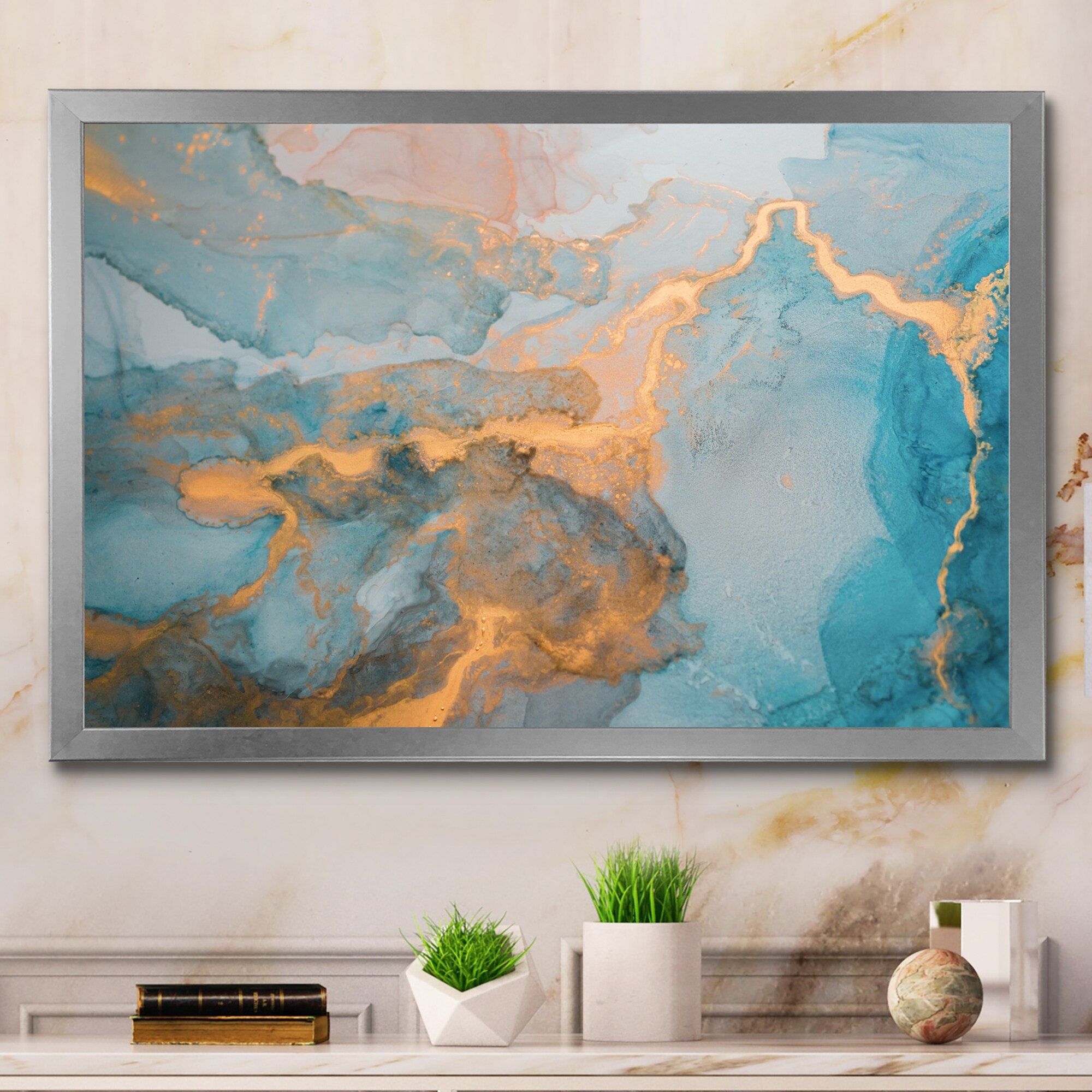 Designart "Golden Grey And Blue Marble Liquid Ink" Glam Framed Art Print