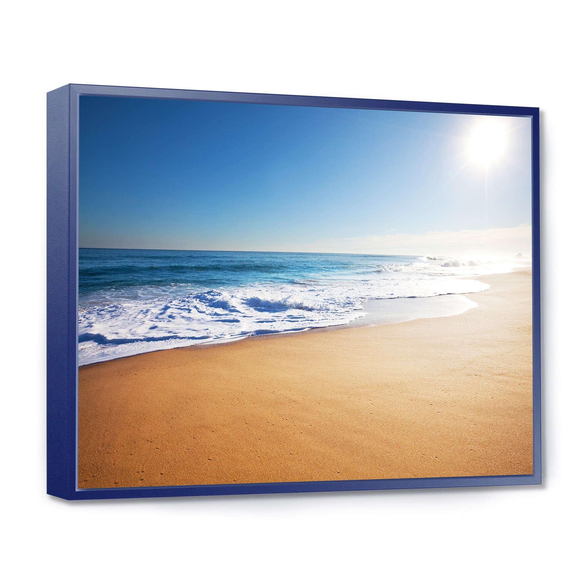 Designart "Calm Blue Seashore with White Sun" Large Seashore Framed Canvas Print
