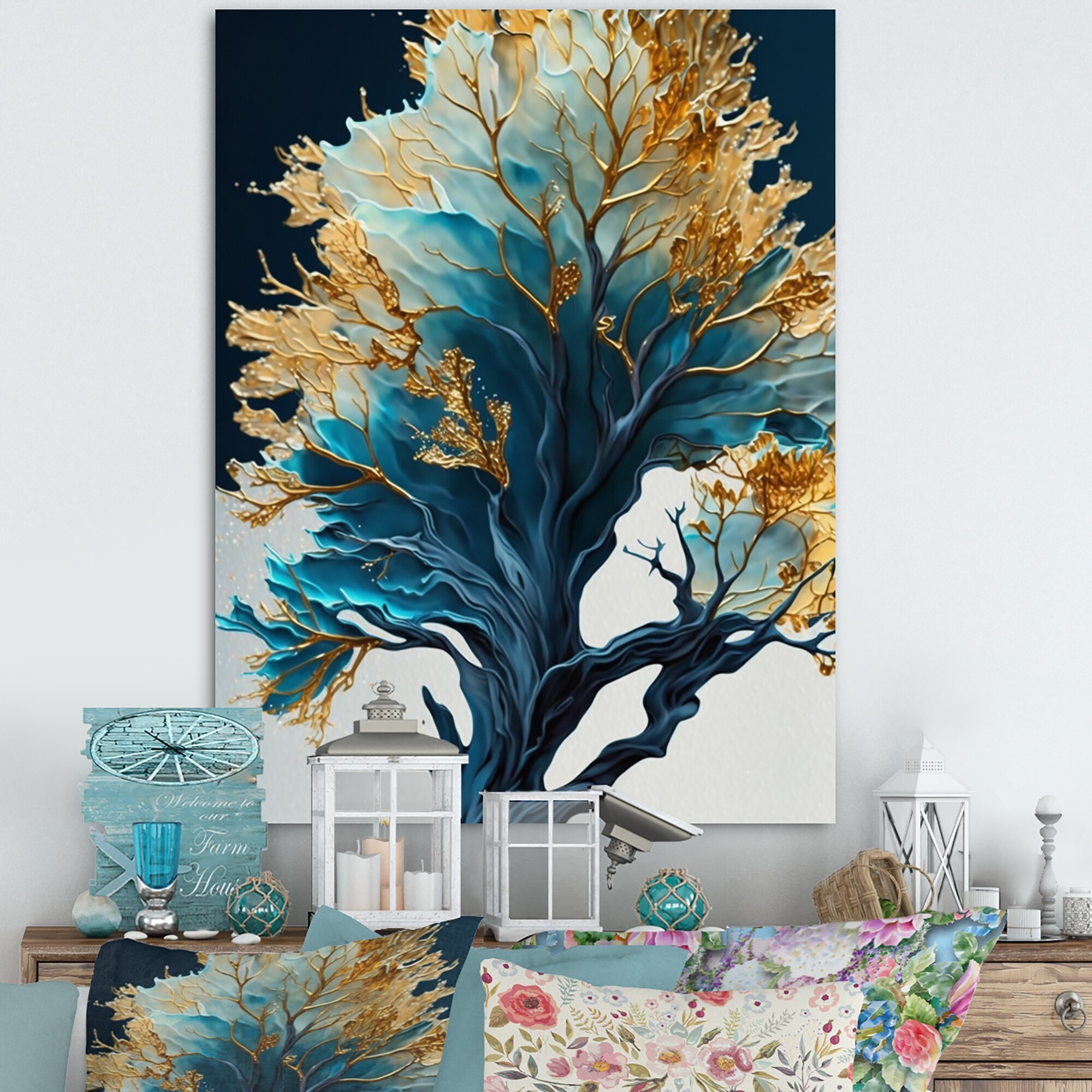 Designart 'Abstract Blue And Gold Leaves IV' Floral & Botanical Canvas Wall Art