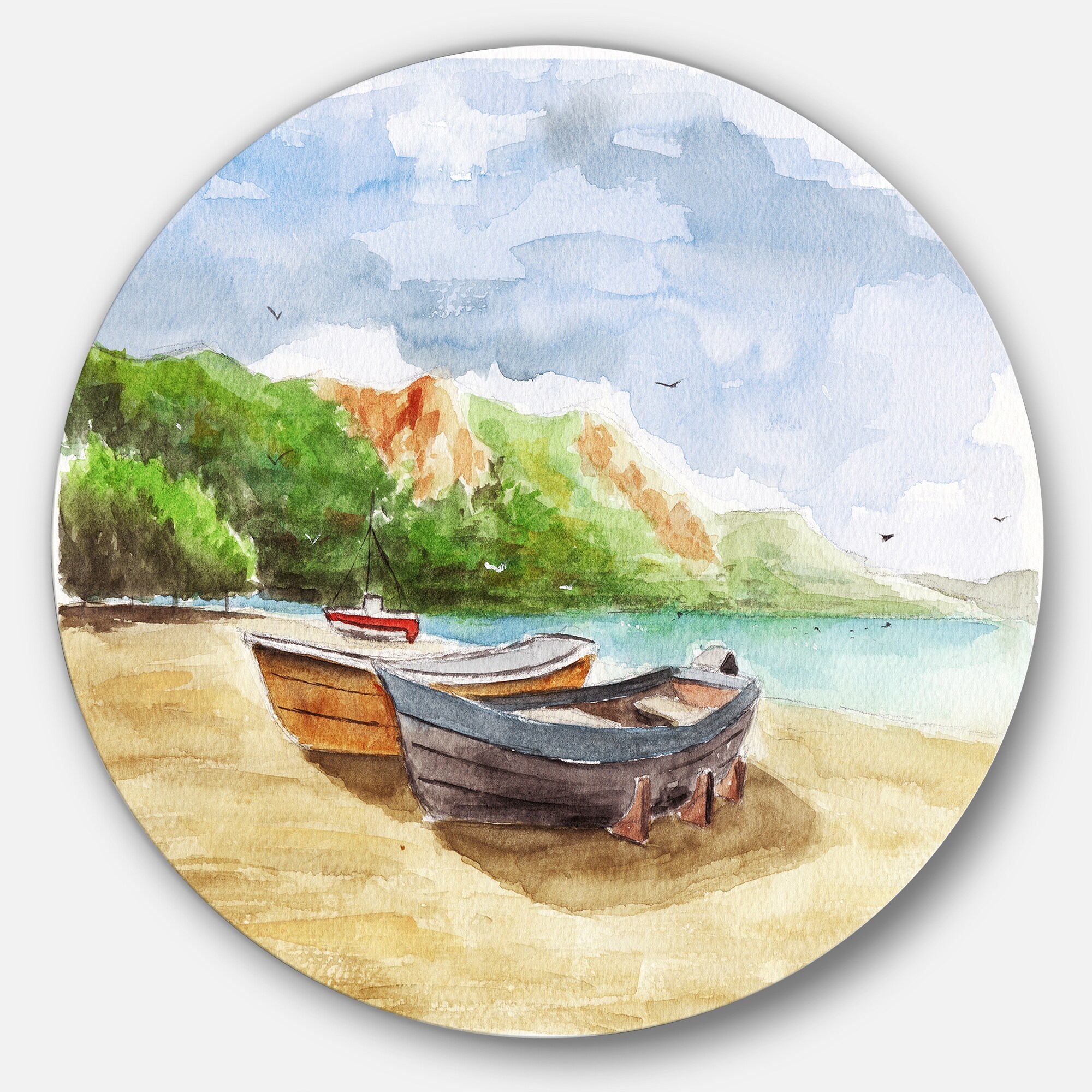 Designart 'Watercolor Fishing Boats' Landscape Glossy Large Disk Metal Wall Art