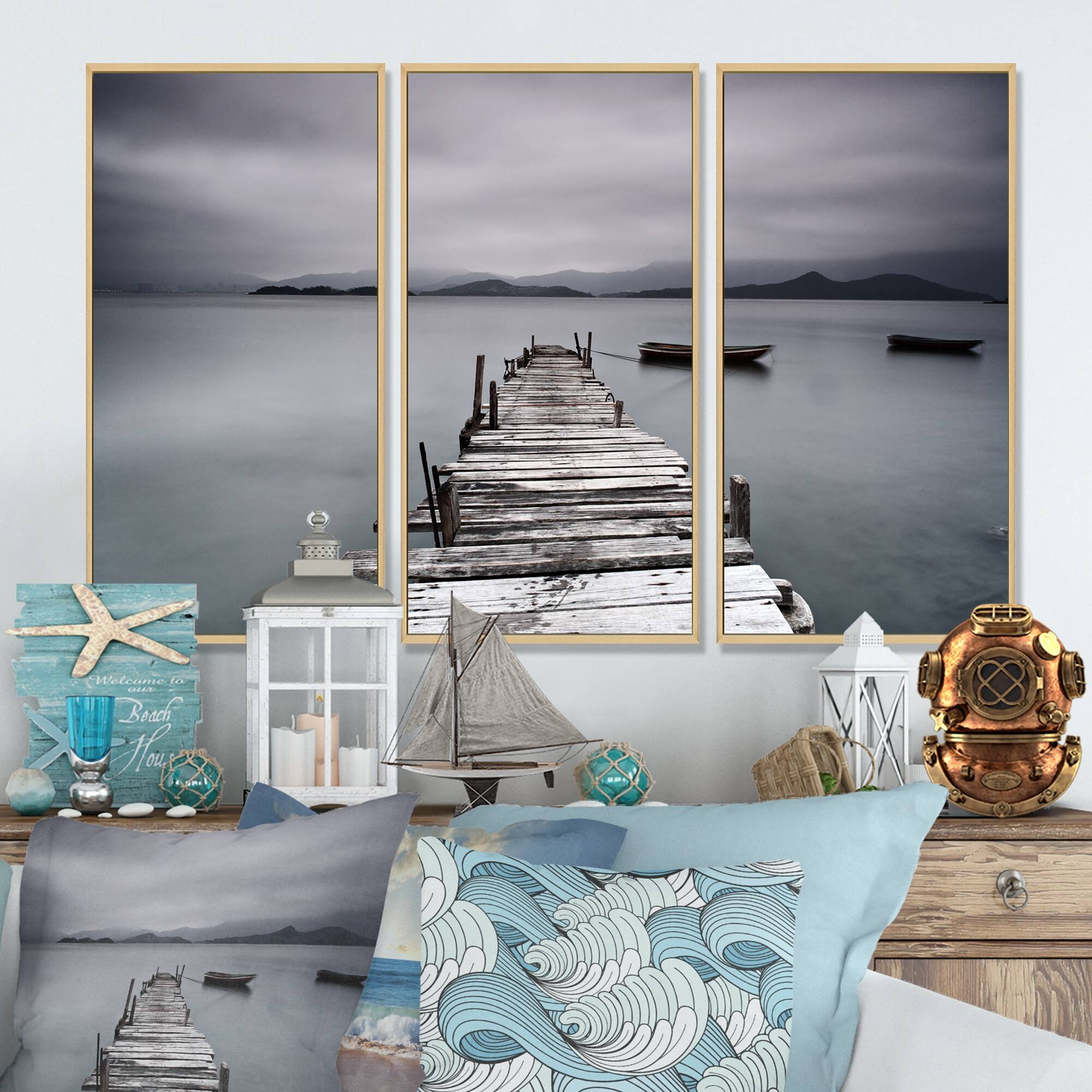 Designart "Pier and Boats at Seashore" Pier & Bridge Framed Wall Art Set of 3 - 4 Colors of Frames