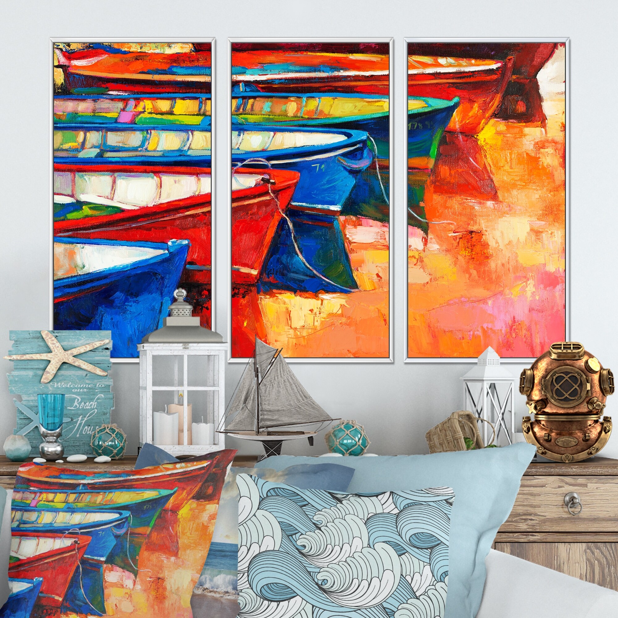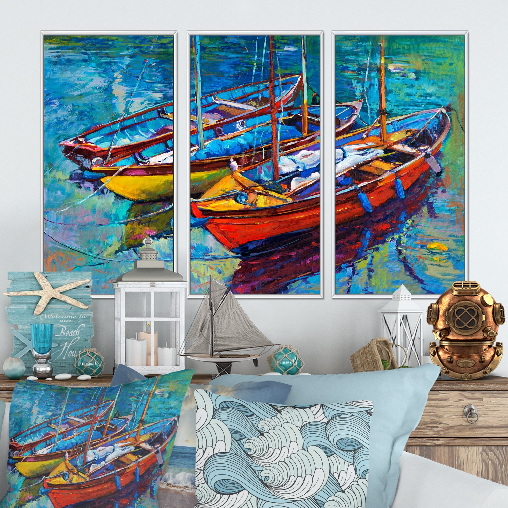 Designart "Three Boats in the Harbor" Nautical & Coastal Framed Wall Art Set of 3 - 4 Colors of Frames