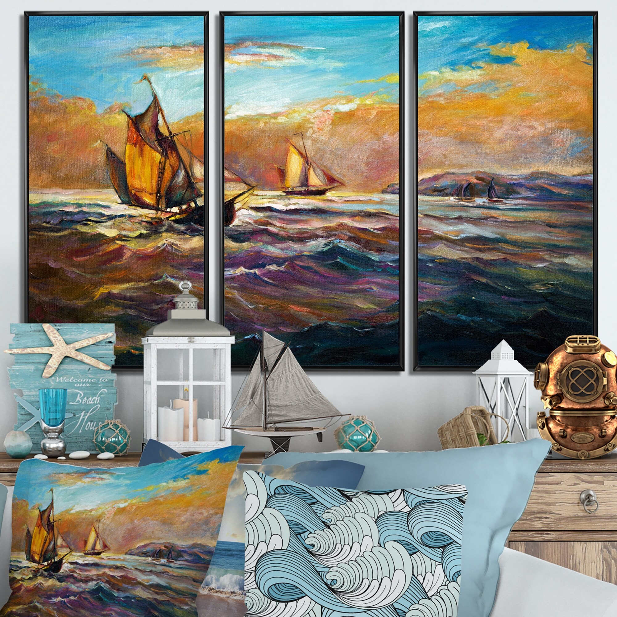 Designart "Sailboat During Exotic Sunset " Coastal Boat Framed Canvas Wall Art Print - 3 Panels