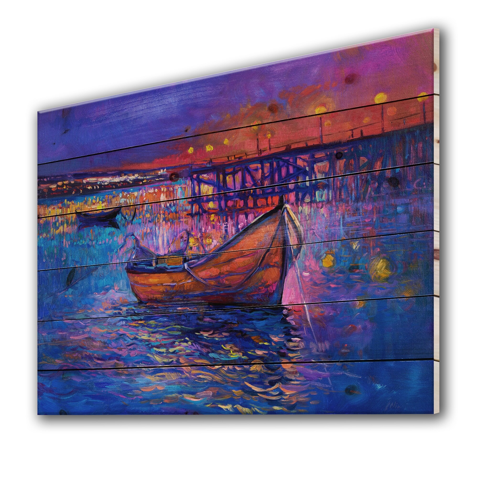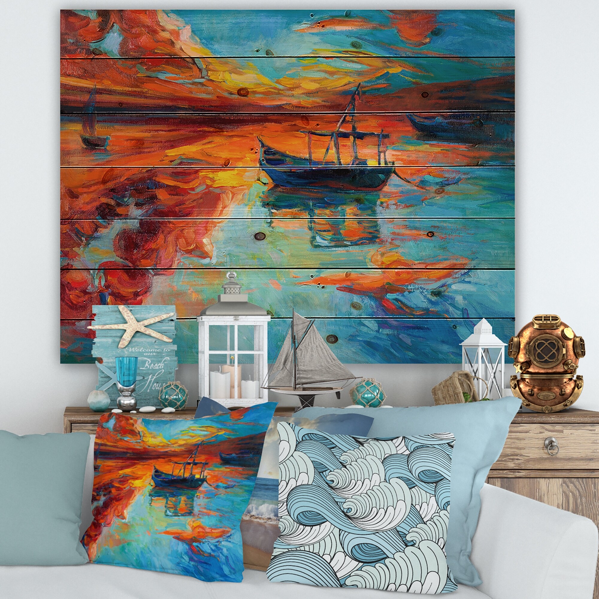 Designart 'Little Boats Arriving the At Shore During Sunset VI' Farmhouse Print on Natural Pine Wood