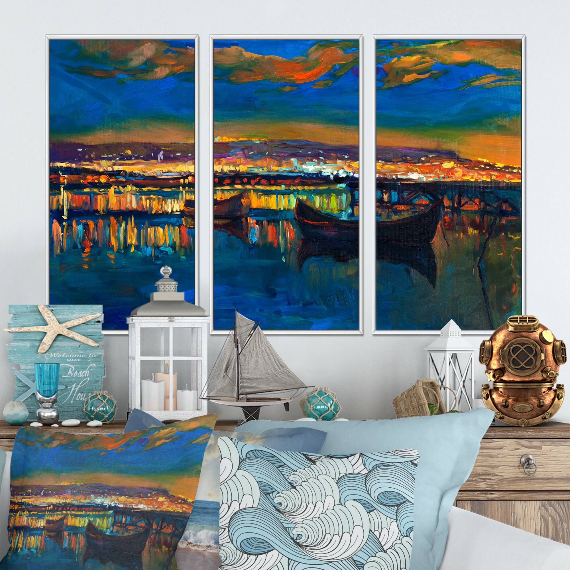 Designart "Boats In the Harbor During Warm Colourd Sunset II" Nautical & Coastal Framed Wall Decor Set of 3 - 4 Colors of Frames