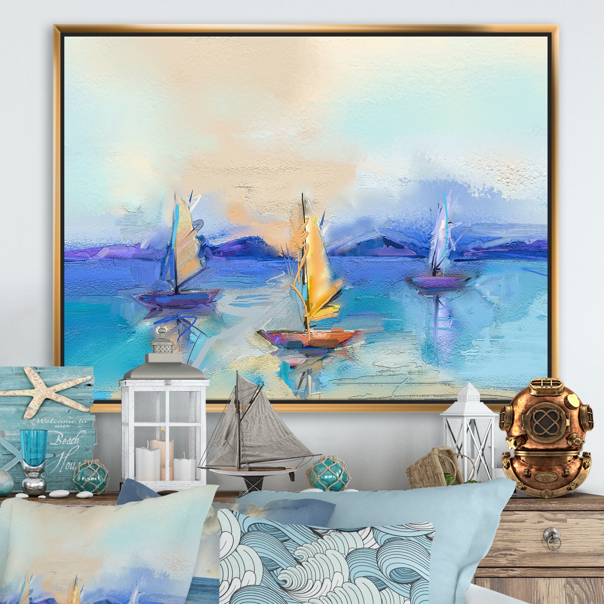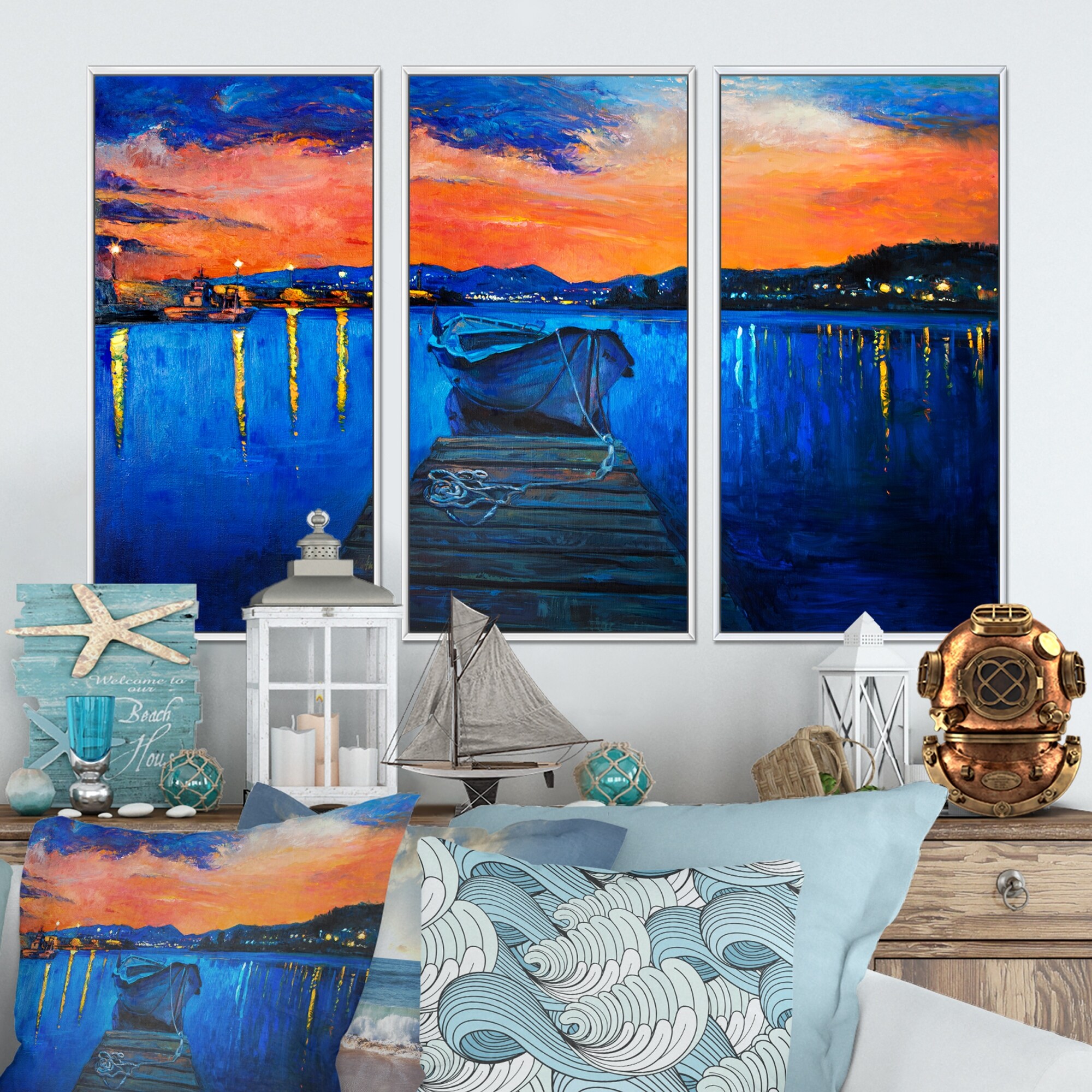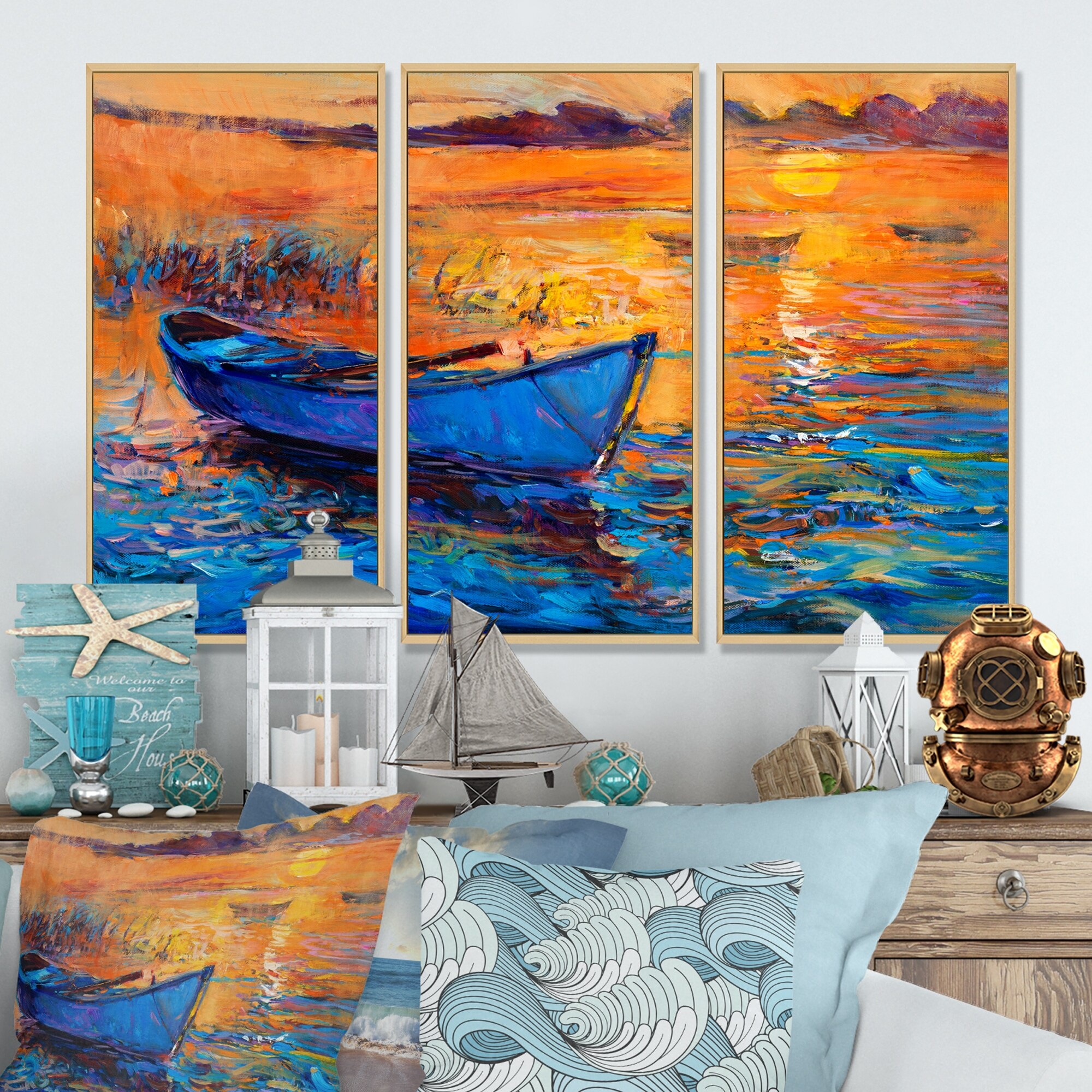 Designart "Blue Boats in Calm Sunset" Nautical Framed Wall Decor Set of 3 - 4 Colors of Frames