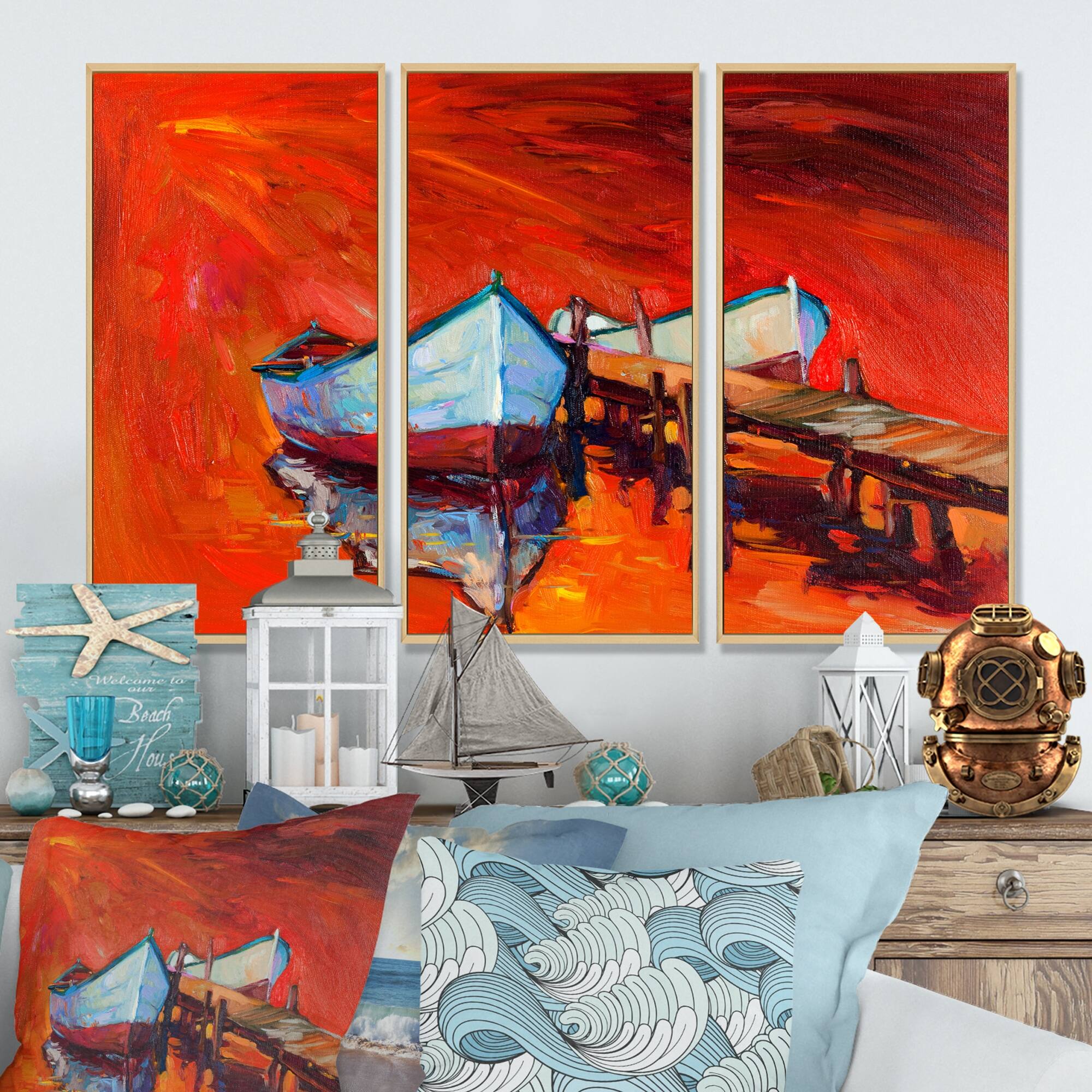 Designart "Boats Resting on the Water During Warm Sunset III" Nautical & Coastal Framed Canvas Wall Art Print - 3 Panels