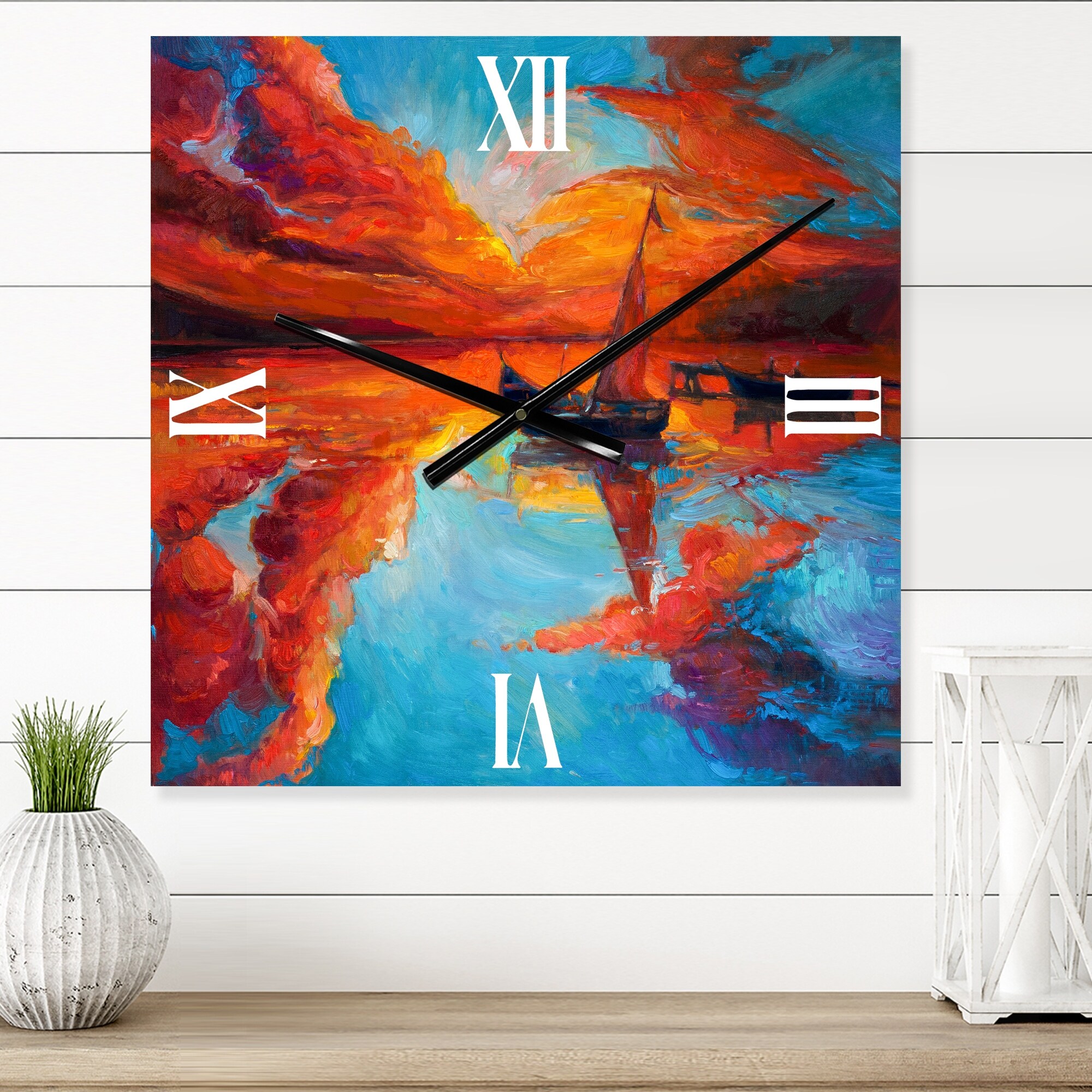 Designart 'Little Boat During Warm Deep Red Sunset' Nautical & Coastal Metal Wall Clock