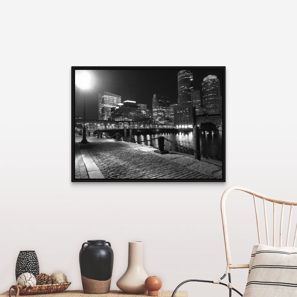 "Boston Night Skyline B" Black Float Frame Canvas Art