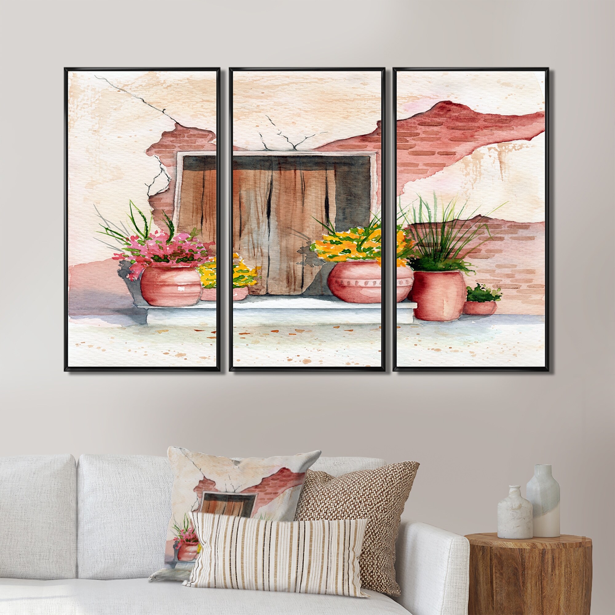 Designart "Old Wooden Door Brick Wall And Some Plants I" Vintage Framed Canvas Wall Art Set of 3 - 4 Colors of Frames