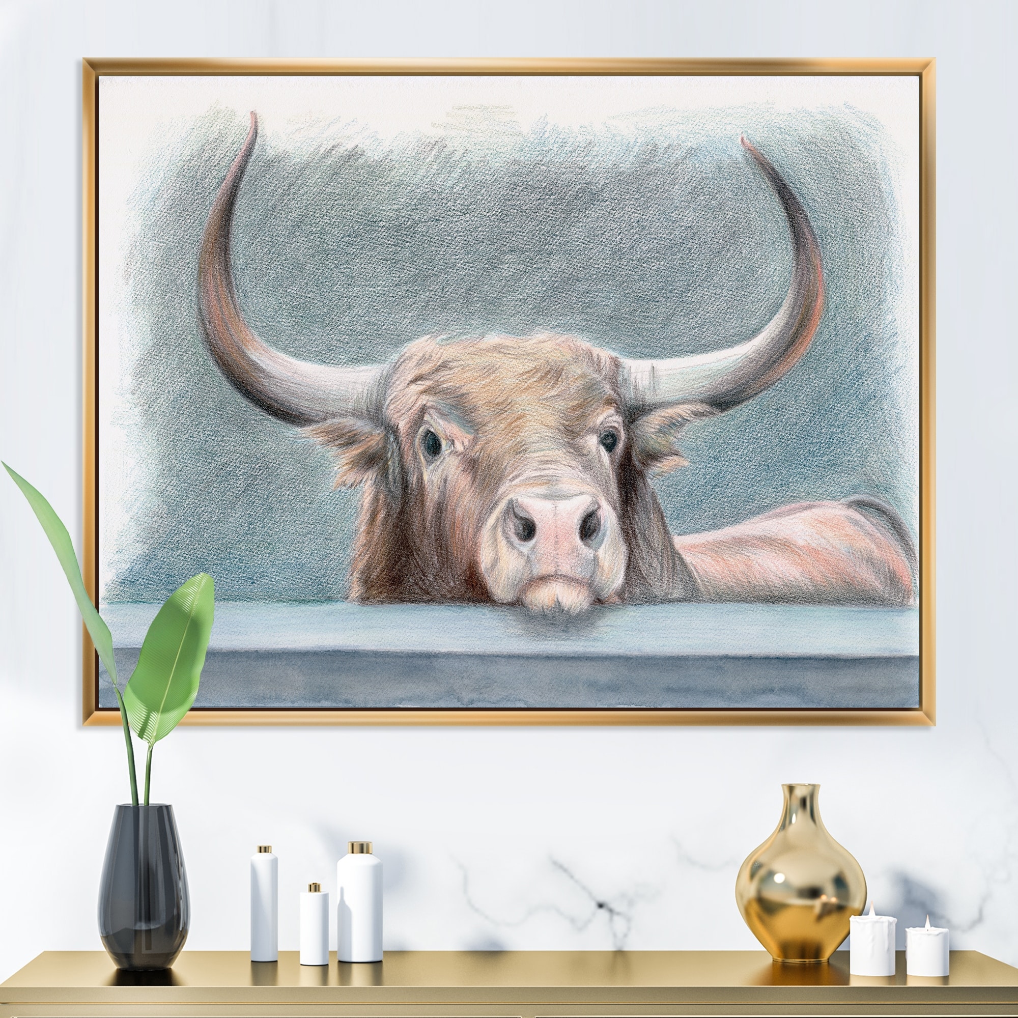 Designart "Big Bull With Horns Behind A Low Wall" Traditional Framed Canvas Wall Art Print