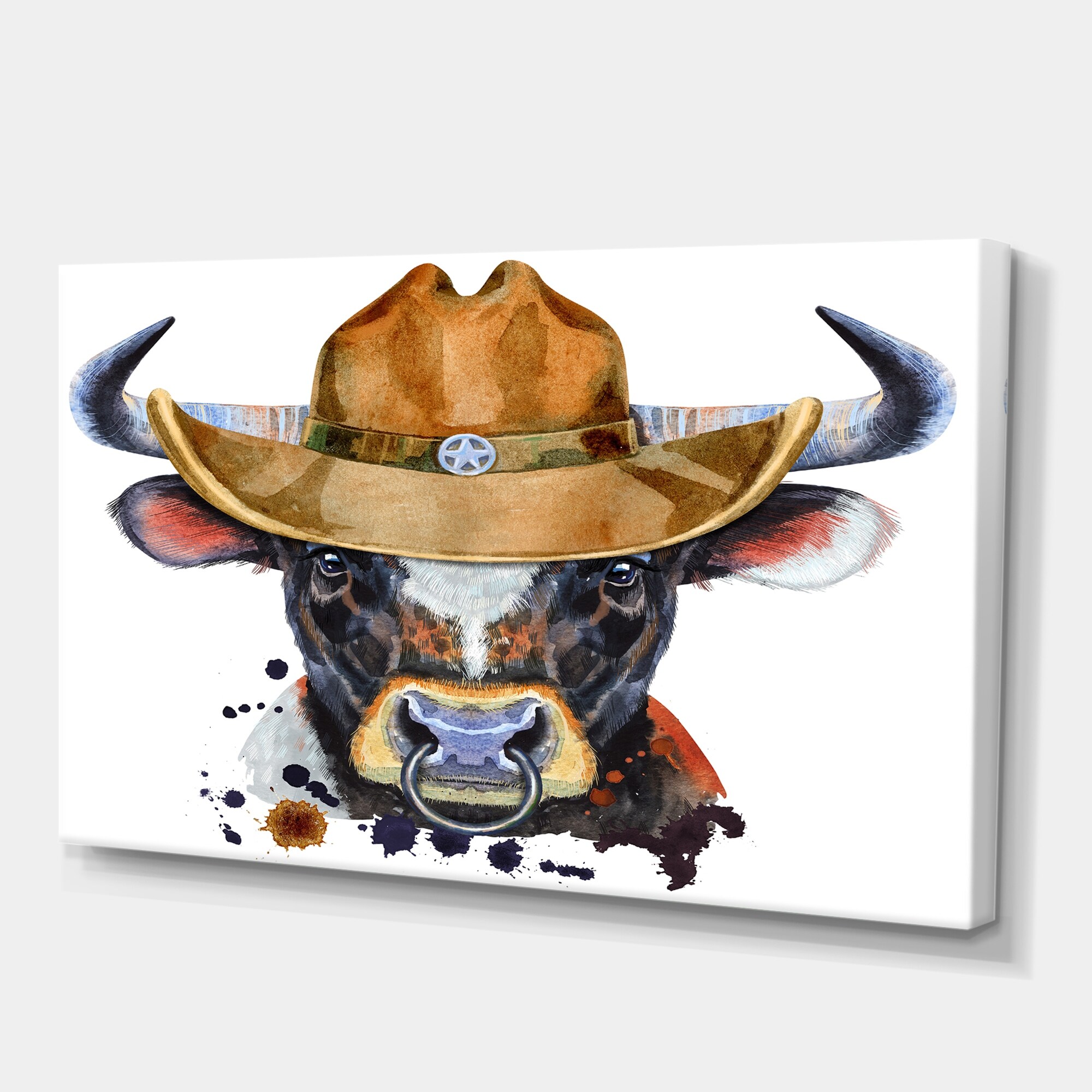 Designart "Watercolor Bull With Summer Hat III" Animals Canvas Wall Art Print