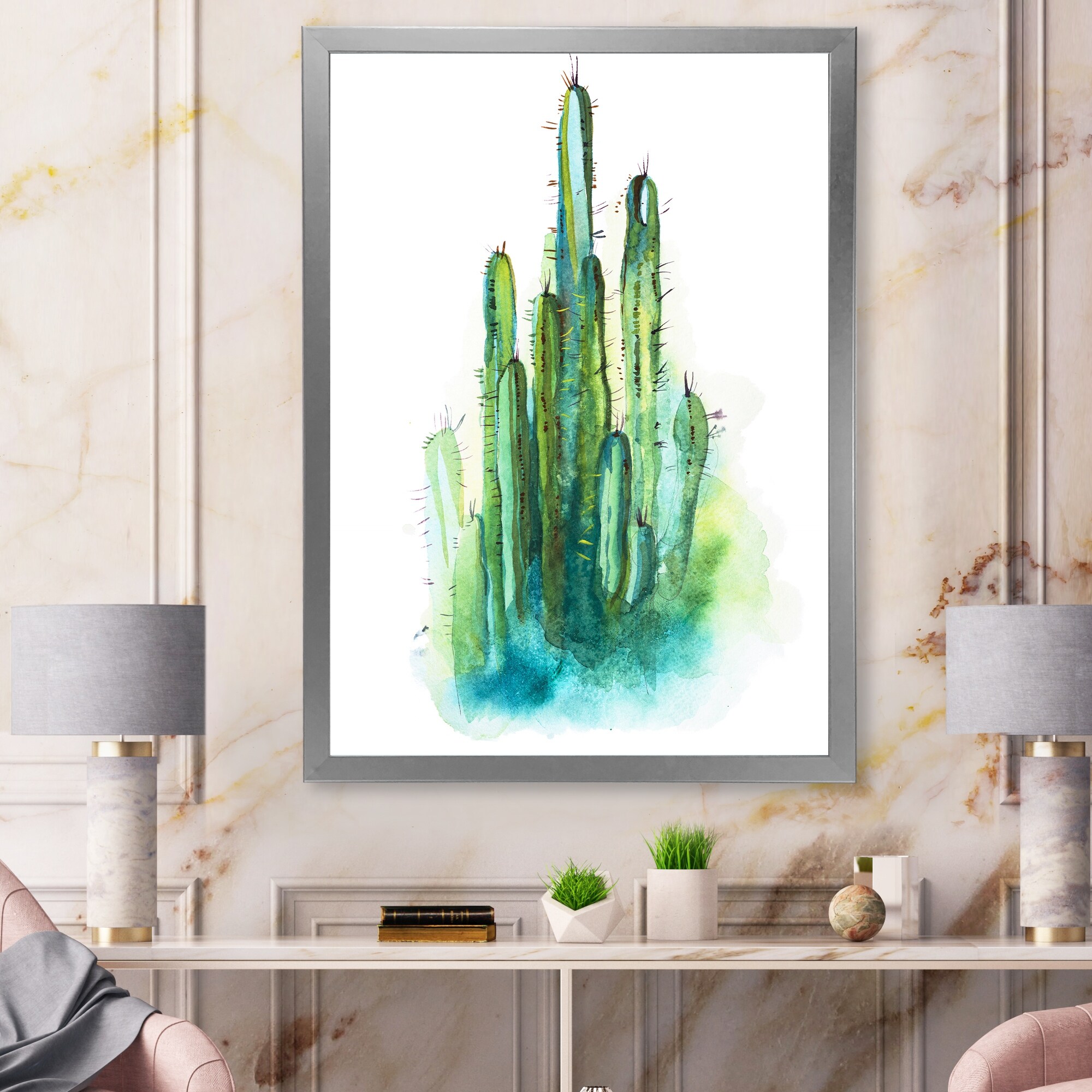 Designart "Pink Green Cactus Desert Royalty Queen" Cactus Framed Wall Art Prints
