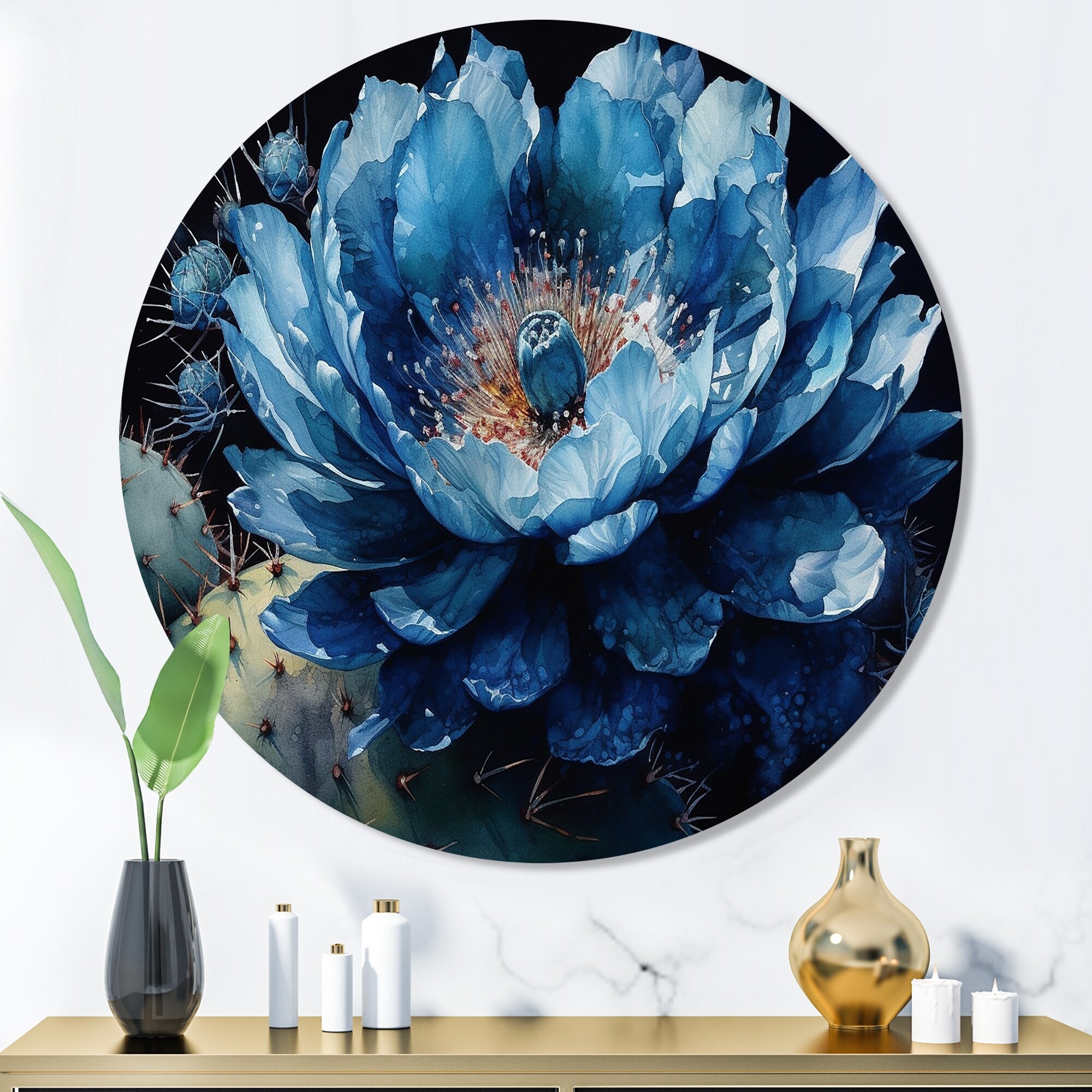 Designart "Blue Green Cactus Beauty" Floral Cactus Metal Round Wall Art