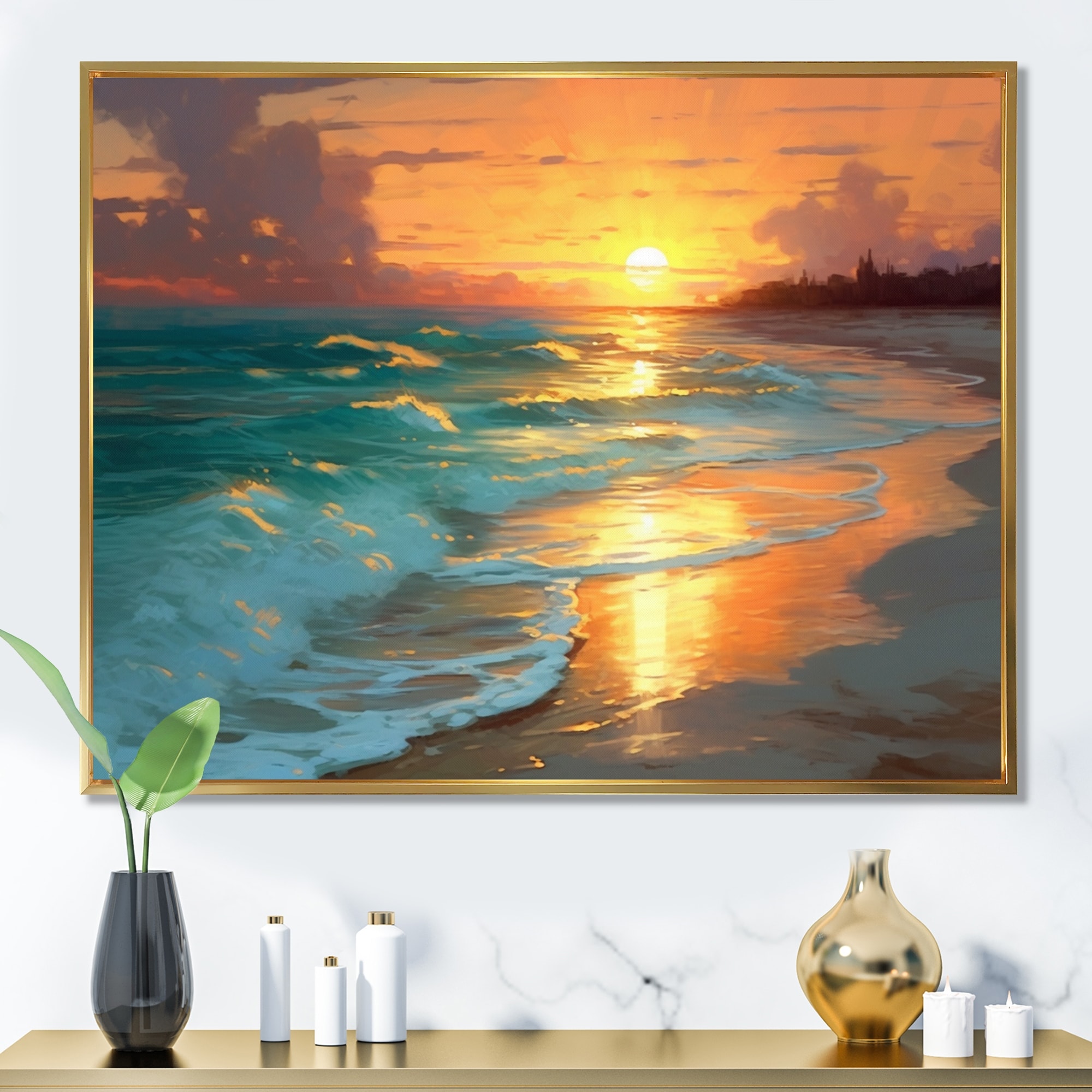Designart "Sand and Blue Caribbean Sea IX" Coastal Sunset Framed Canvas Wall Art