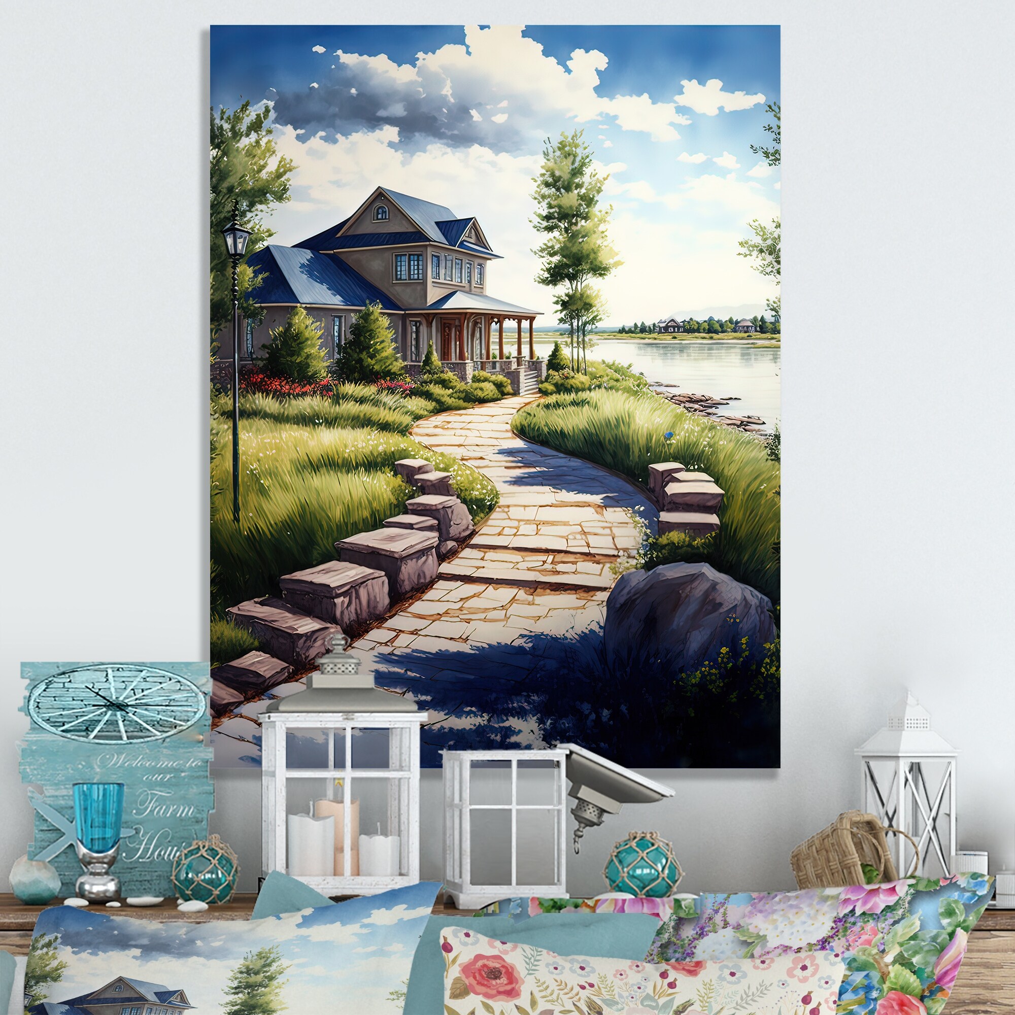 Designart 'Charming Cottage on the Water I' Farmhouse / Country Canvas Wall Art