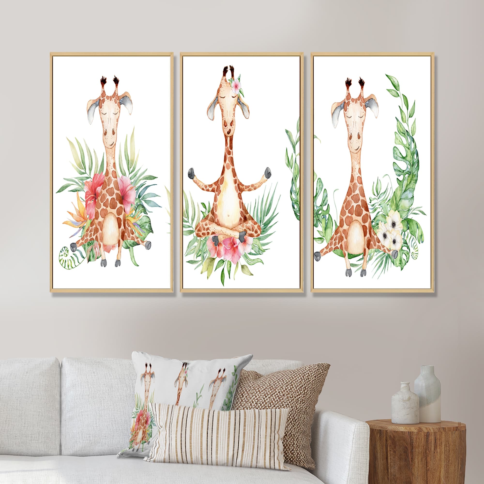 Designart "Cartoon Giraffe With Tropical Flowers I" Children's Art Framed Artwork Set of 3 - 4 Colors of Frames