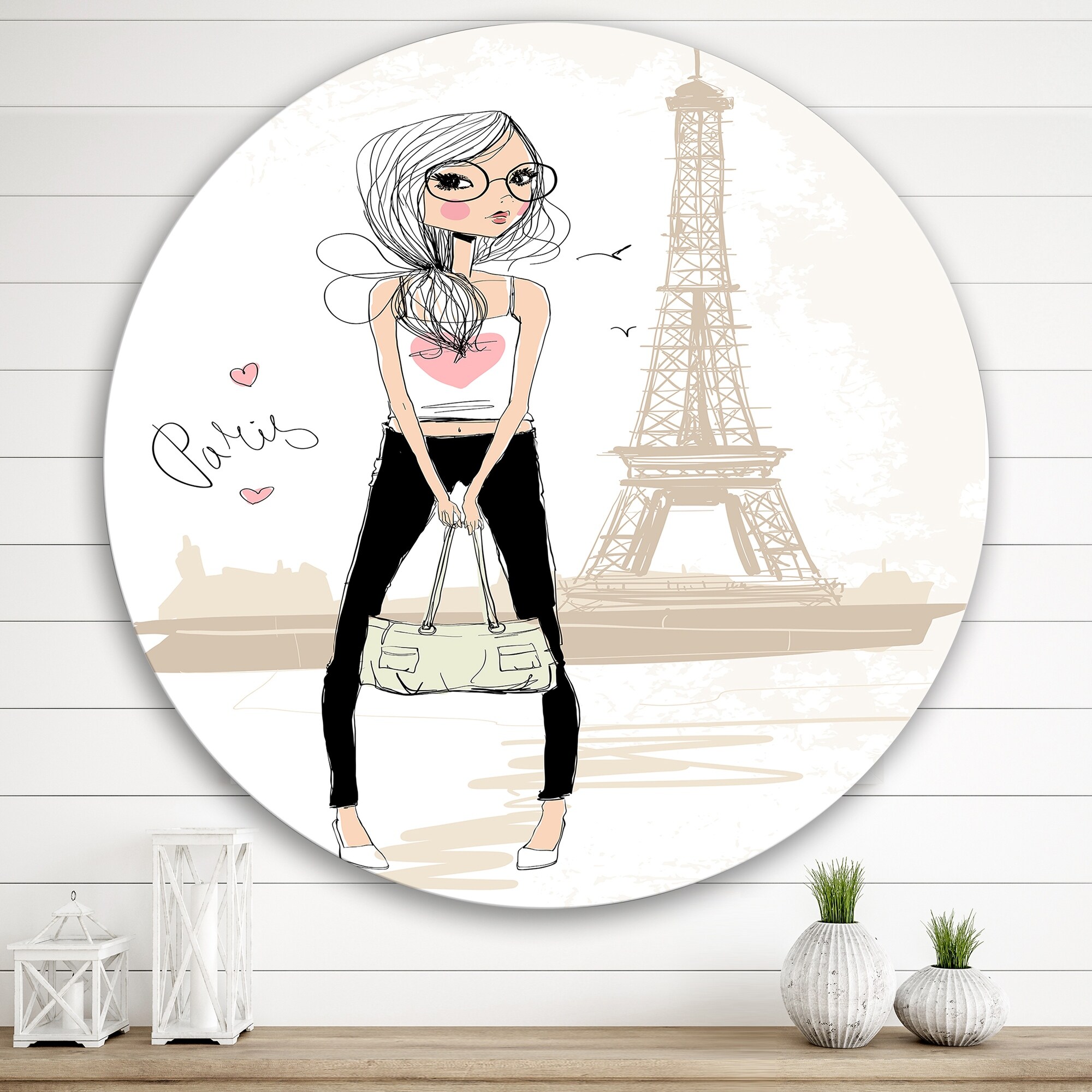 Designart 'Cute Girl By the Tour Eiffel in Paris' Children's Art Metal Circle Wall Art