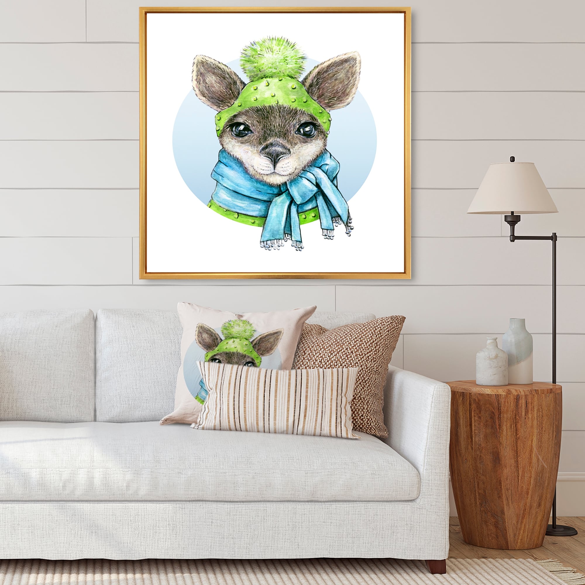 Designart "Portrait Of a Little Kangeroo With A Green Hat" Children's Art Framed Canvas Wall Art Print