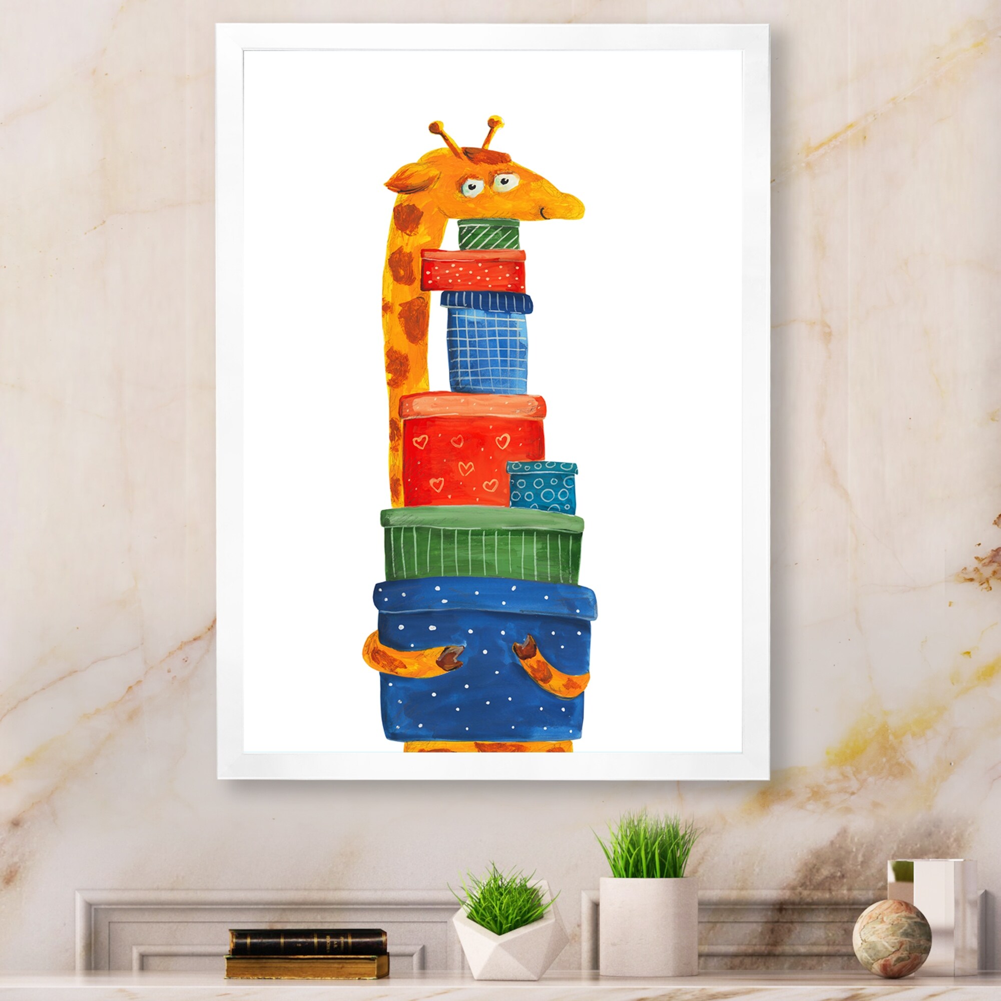 Designart "Cute Giraffe With Gift Boxes" Children's Art Framed Wall Decor