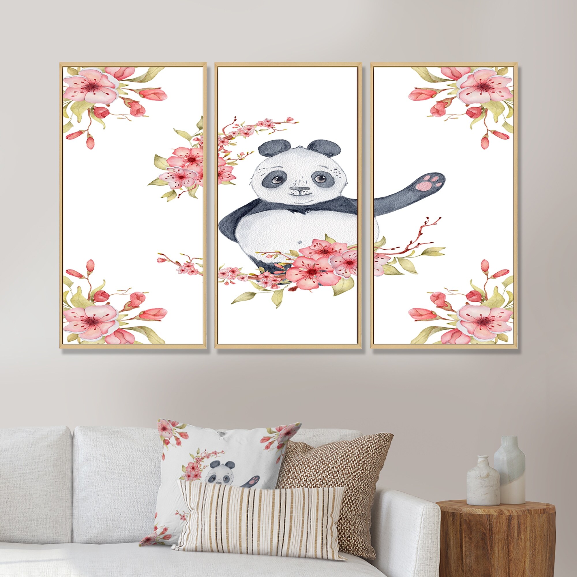 Designart "Panda Bear With Sakura Flowers" Children's Art Framed Wall Art Set of 3 - 4 Colors of Frames