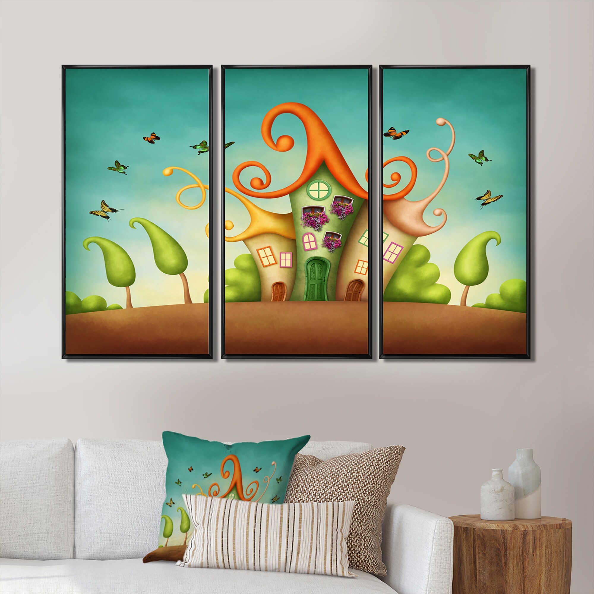 Designart "Blue Fantasy Castles With Red Roofs I" Children's Art Framed Wall Decor Set of 3 - 4 Colors of Frames