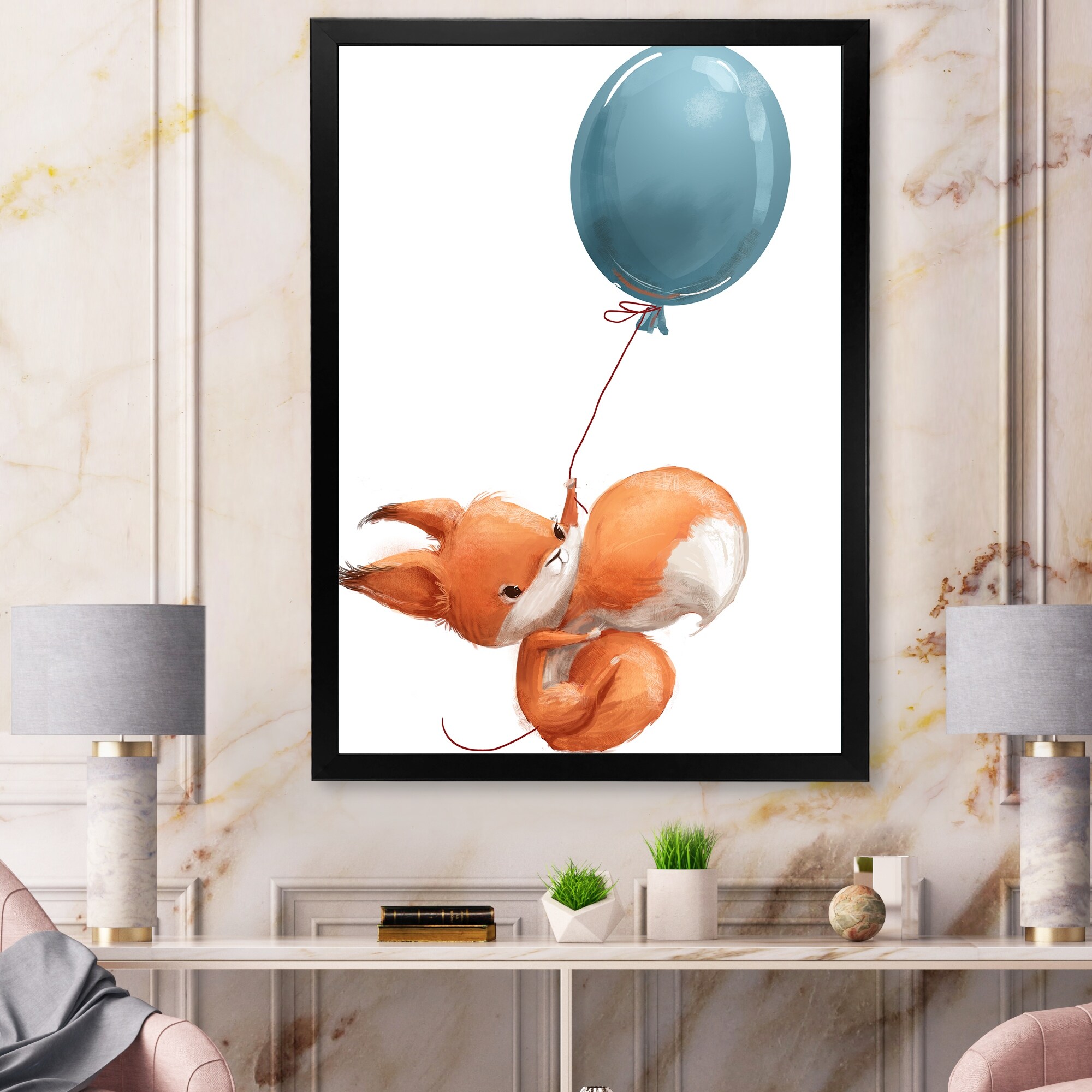 Designart "Cute Little Cartoon Fox Squirrel With Balloon" Children's Art Framed Art Print