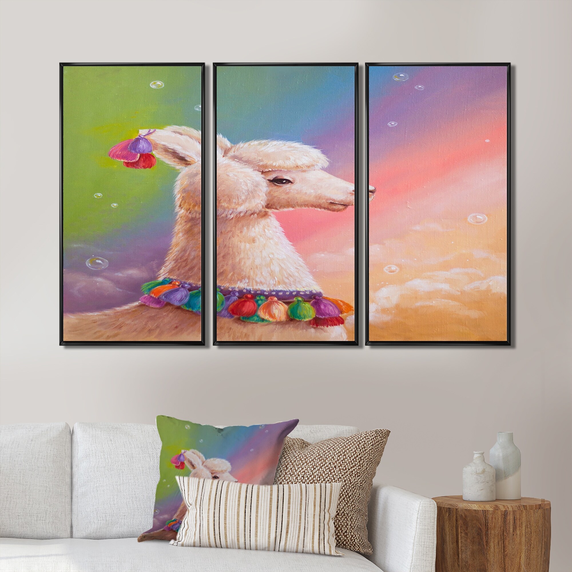 Designart "Portrait Of Lama on Rainbow Sky" Children's Art Framed Art Set of 3 - 4 Colors of Frames