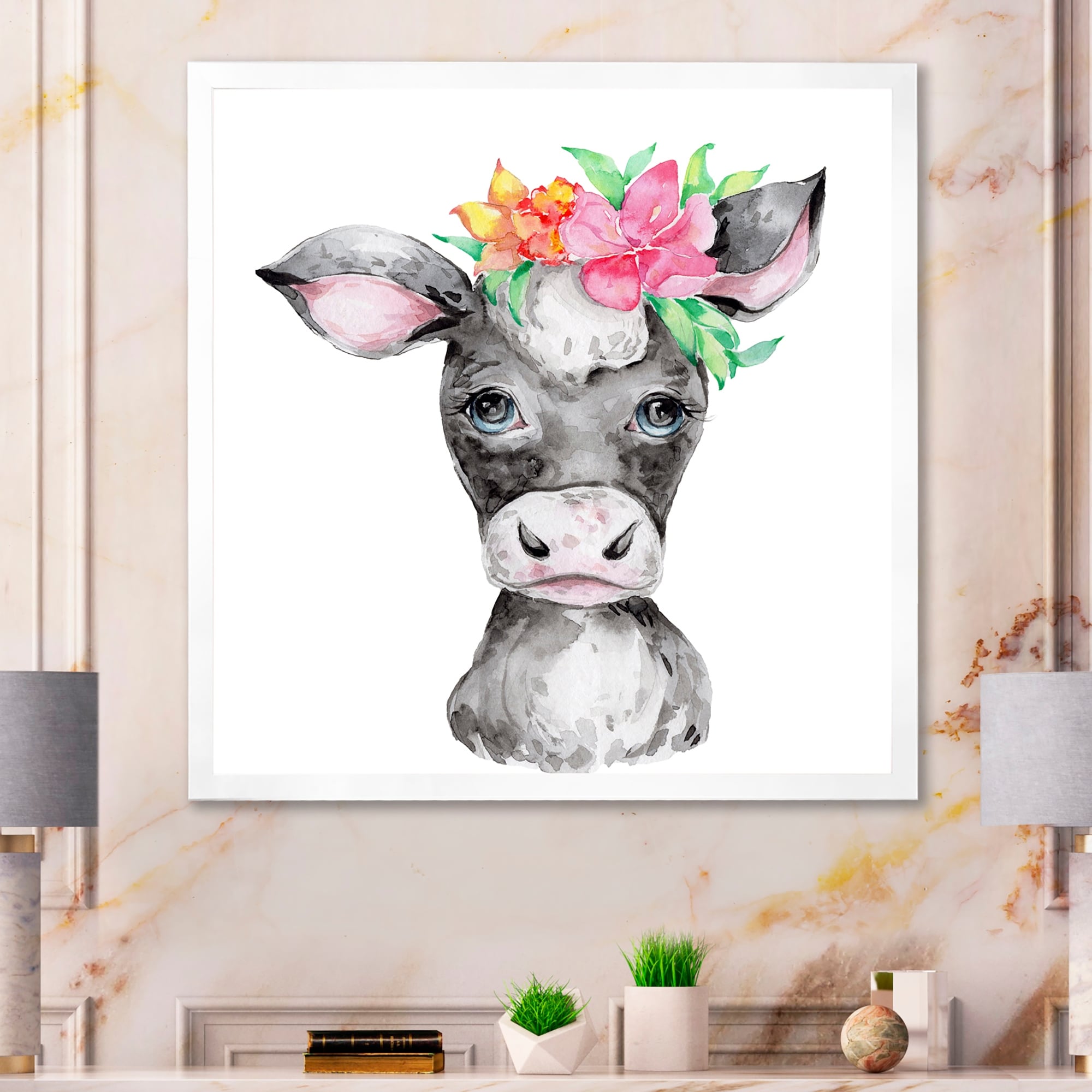 Designart "Cute Cartoon Cow Floral Portrait" Children's Art Framed Wall Decor