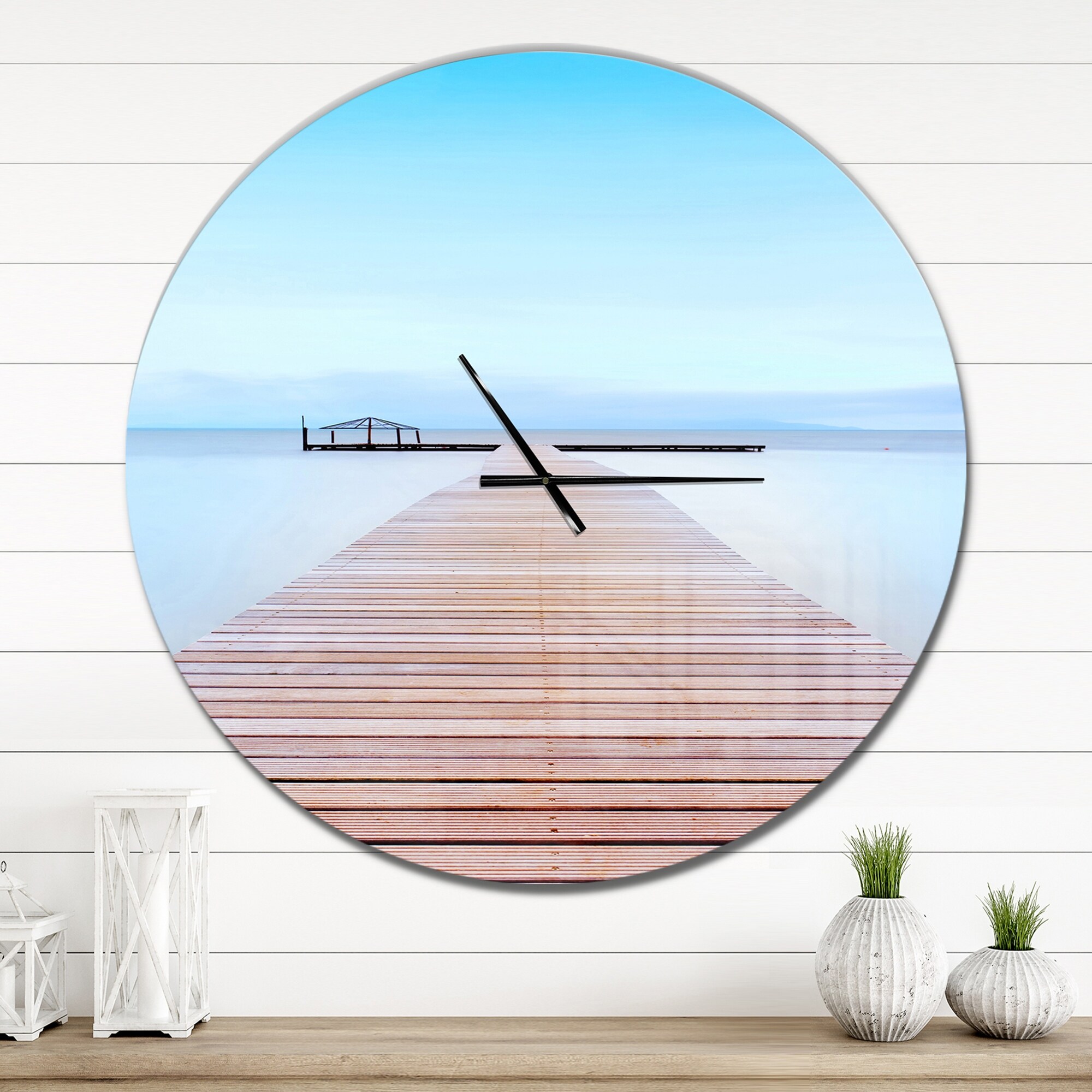 Designart 'Wooden Pier in Cold Atmosphere' Oversized Landscapes Wall CLock