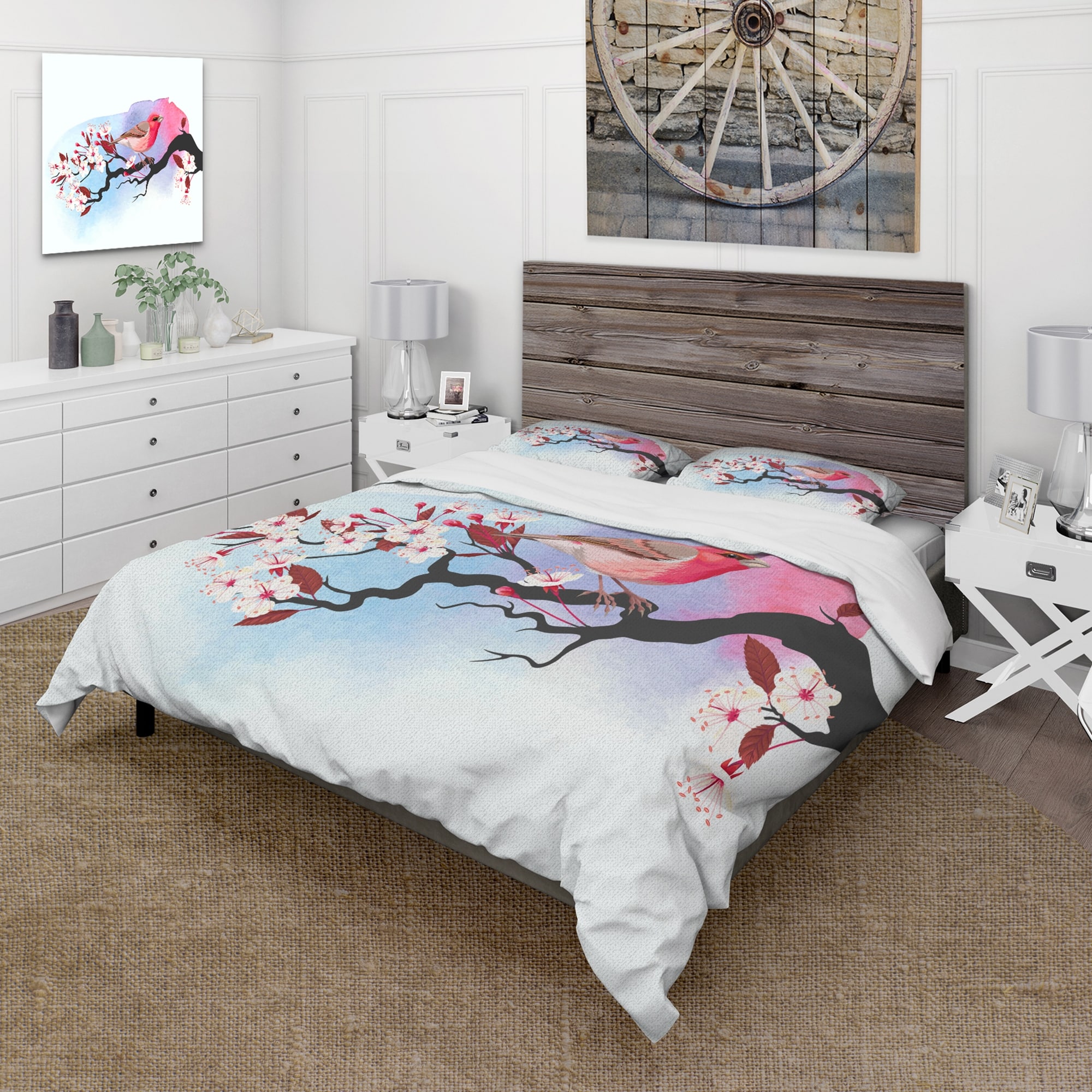 Designart 'Pink Bird on Cherry Branch' Traditional Duvet Cover Comforter Set