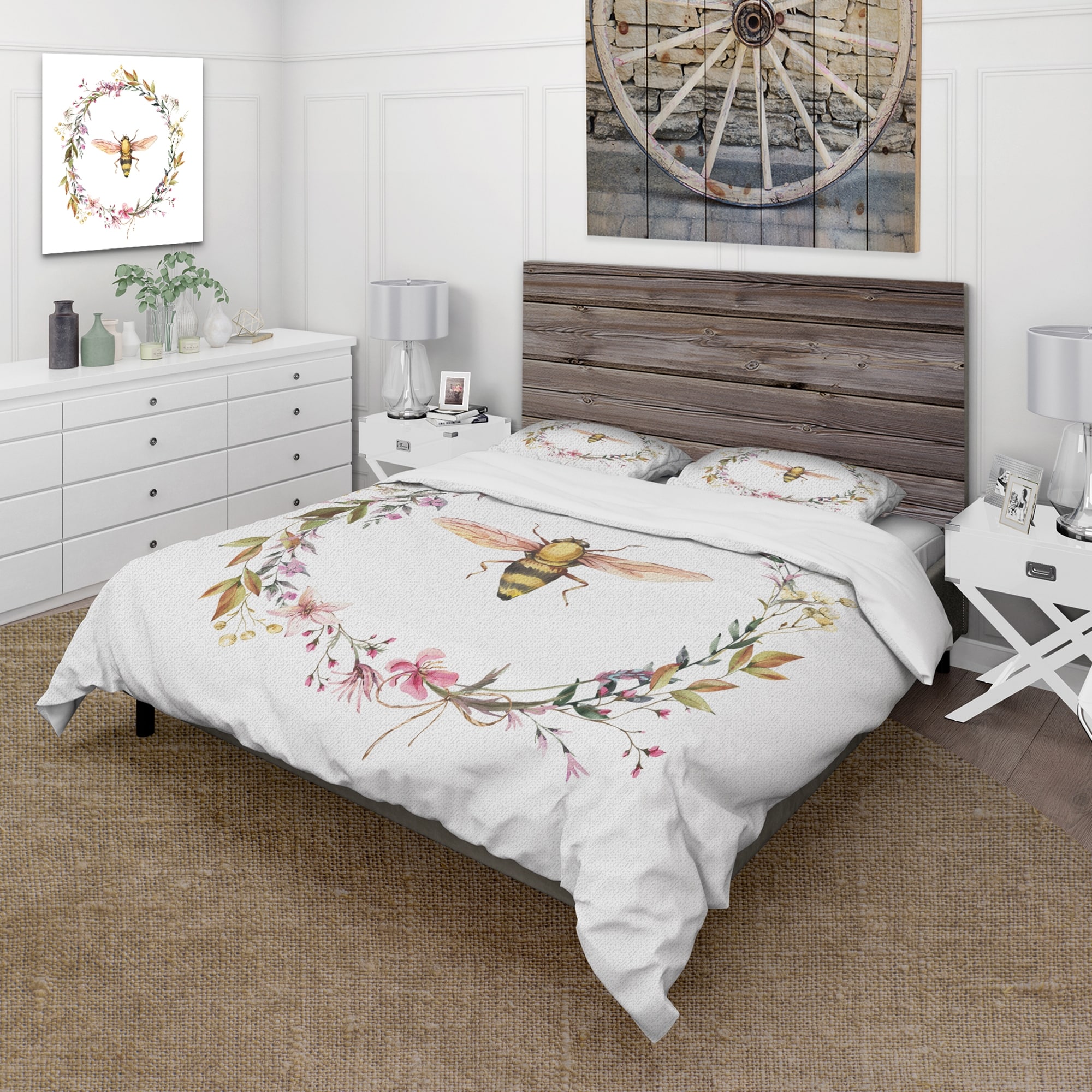 Designart 'Bee In Wildflowers Wreath' Farmhouse Duvet Cover Comforter Set