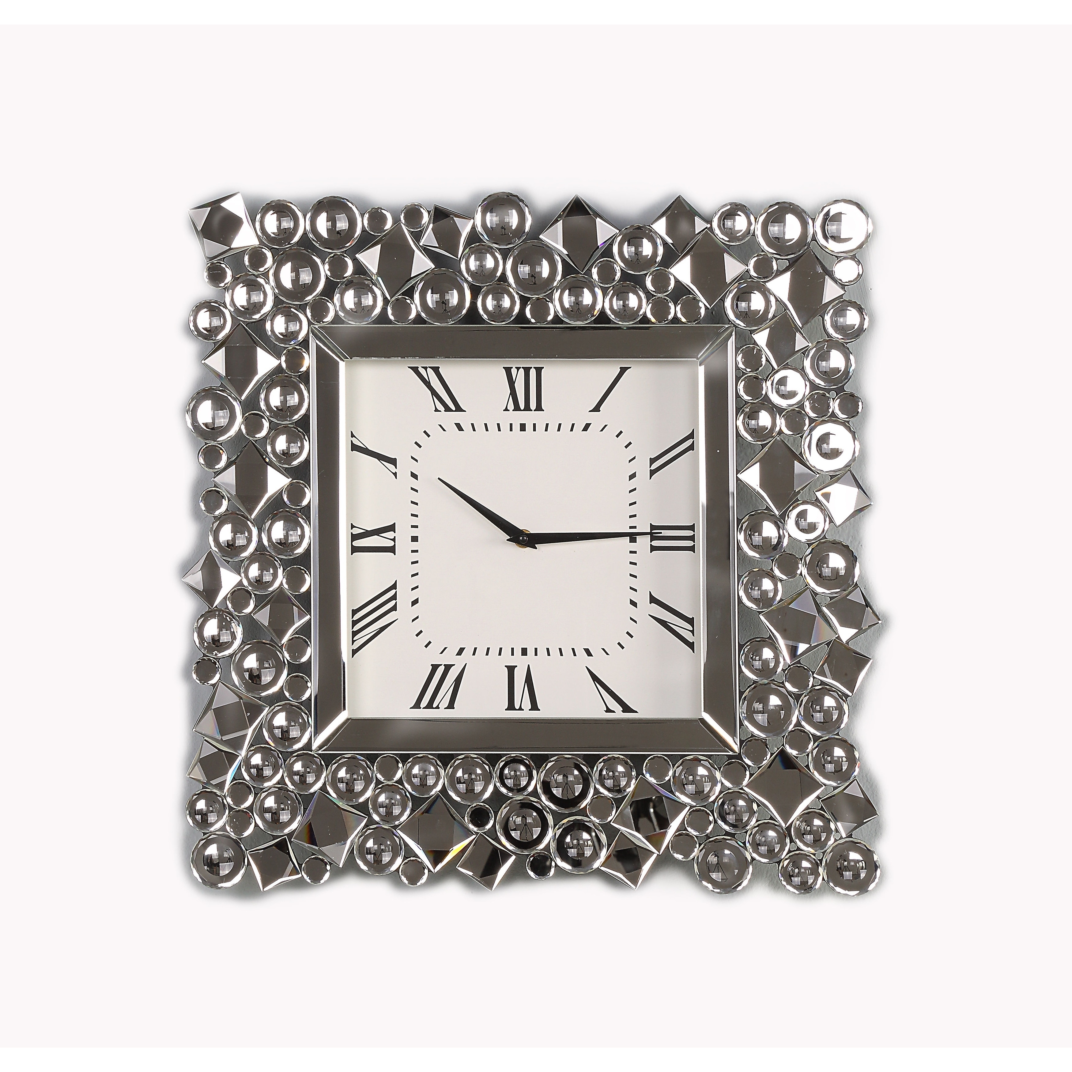 Wood and Mirror Wall Clock with Glass Crystal Gems, Clear and Black