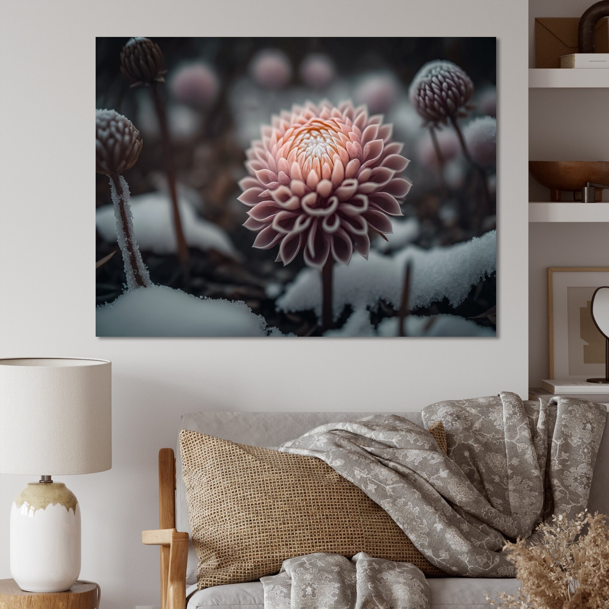 Designart "A Blooming Red Dahlia Flower in Winter III" Floral & Botanical Framed Canvas Art Print