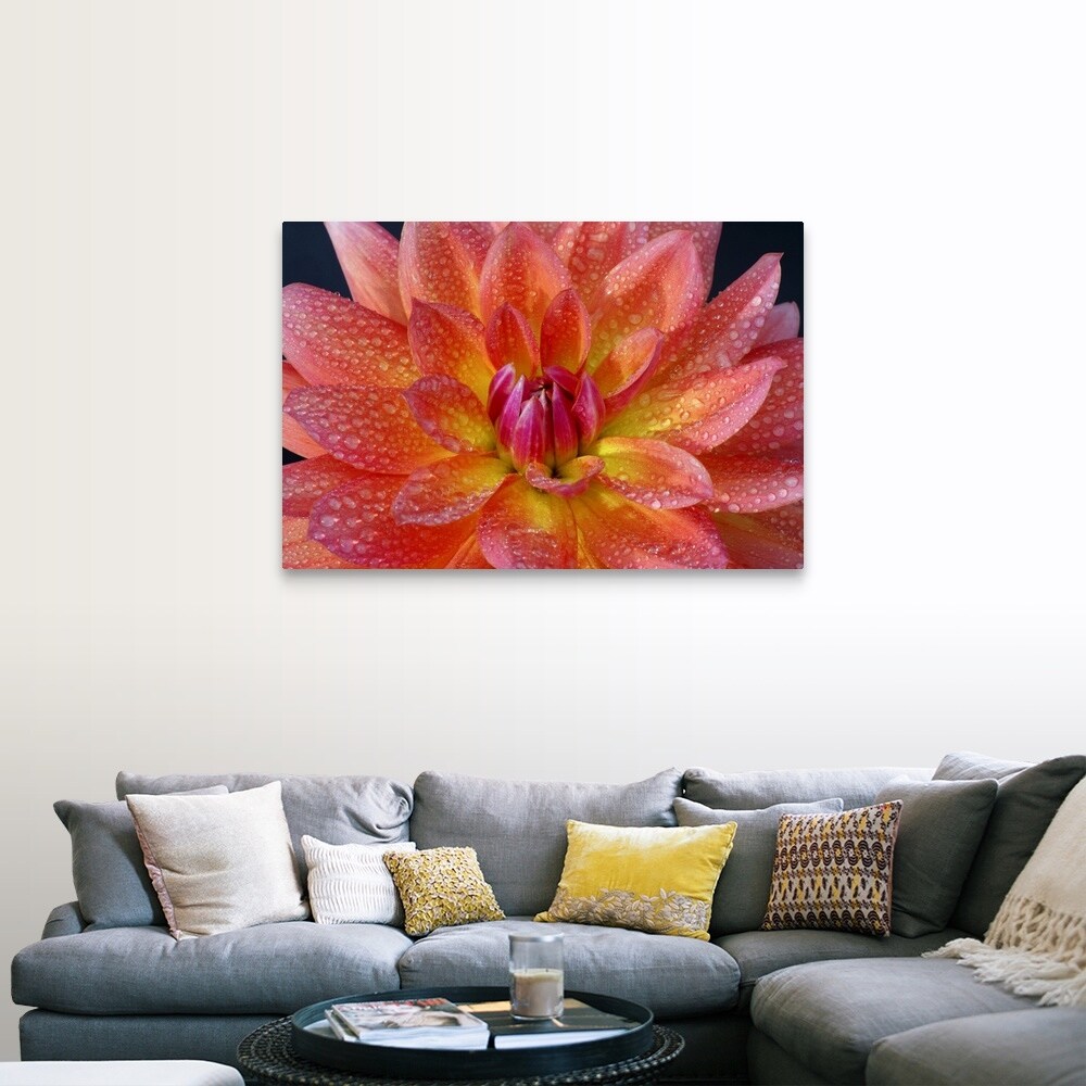 "Close up of center of orange dahlia, with water drops on petals" Canvas Wall Art