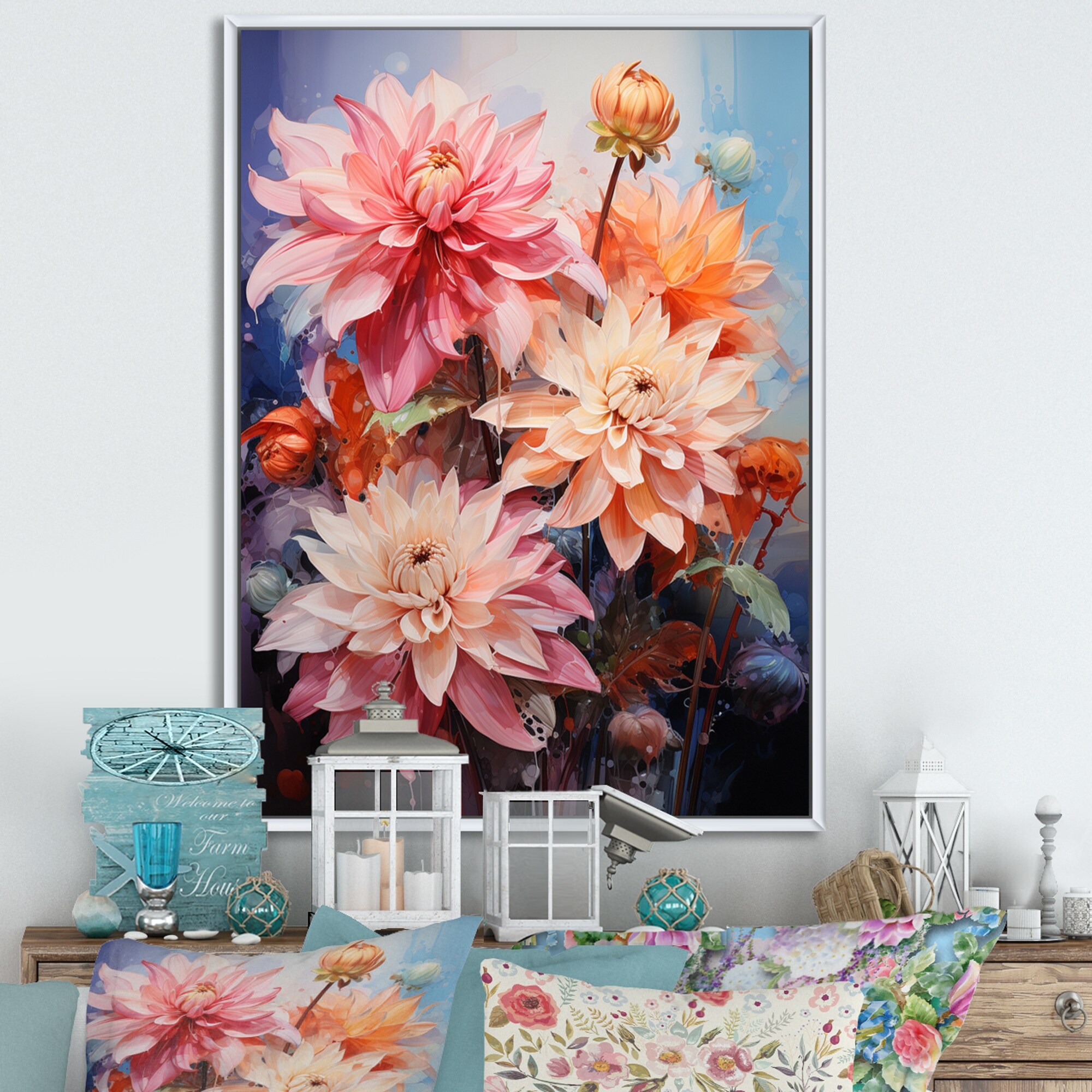 Designart "Dahlia Representation Multicolored Acrylic II" Dahlia Framed Wall Art Living Room