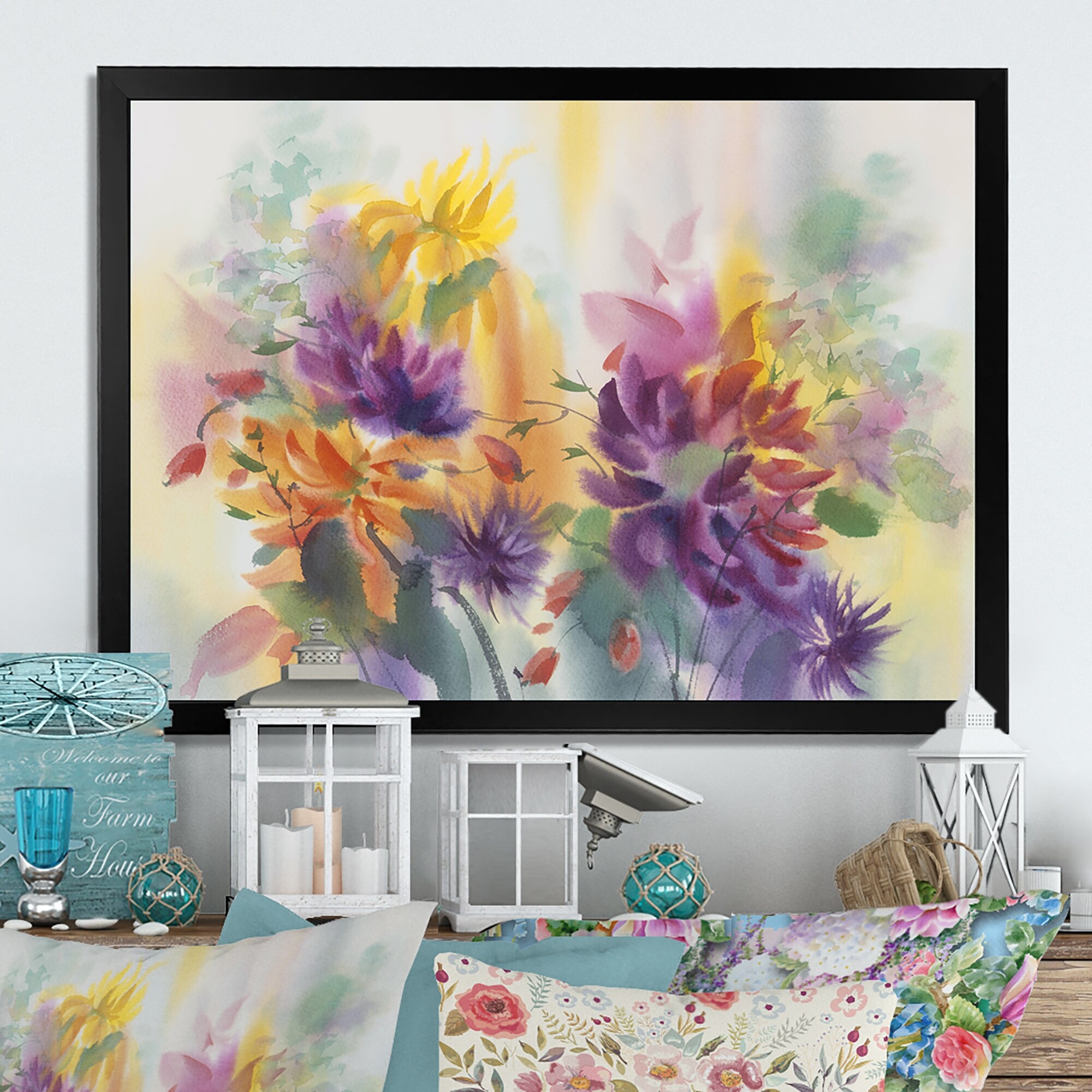Designart "Yellow And Violet Dahlias" Traditional Framed artwork