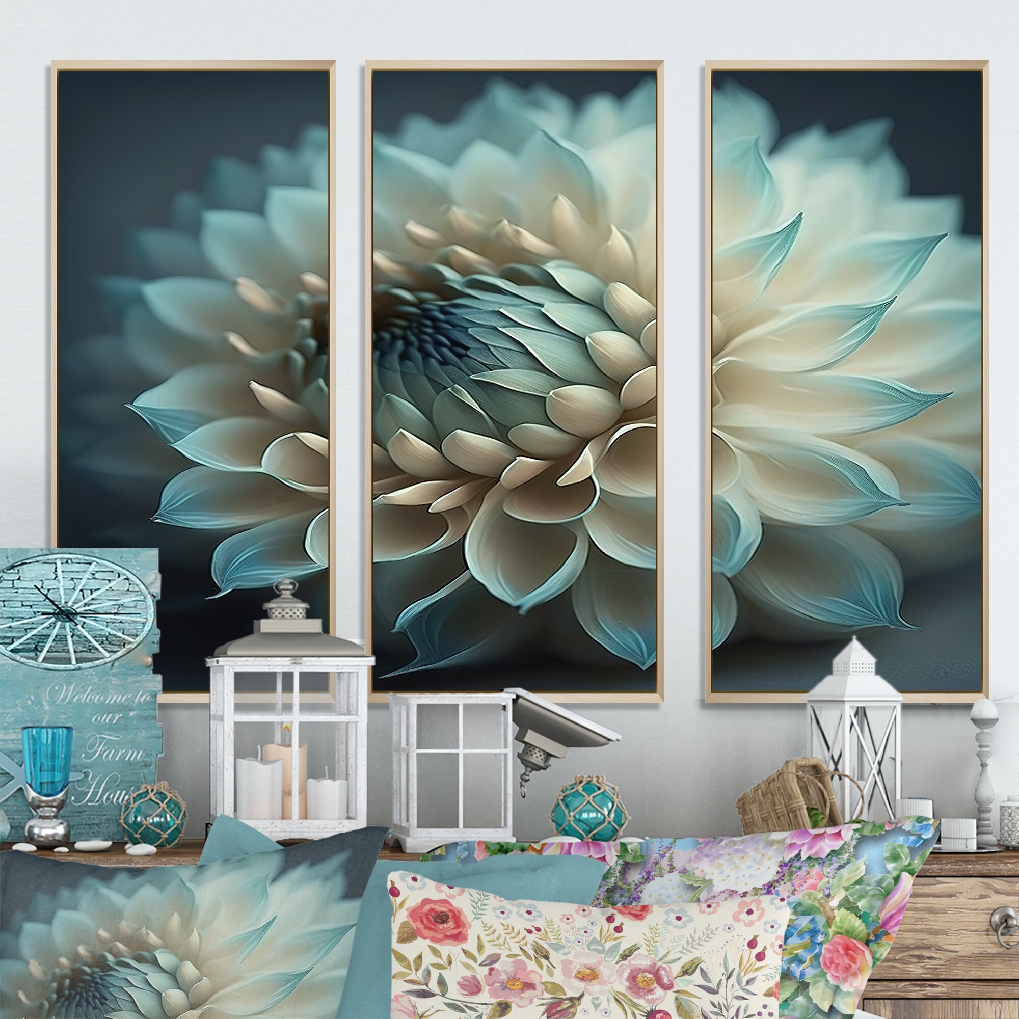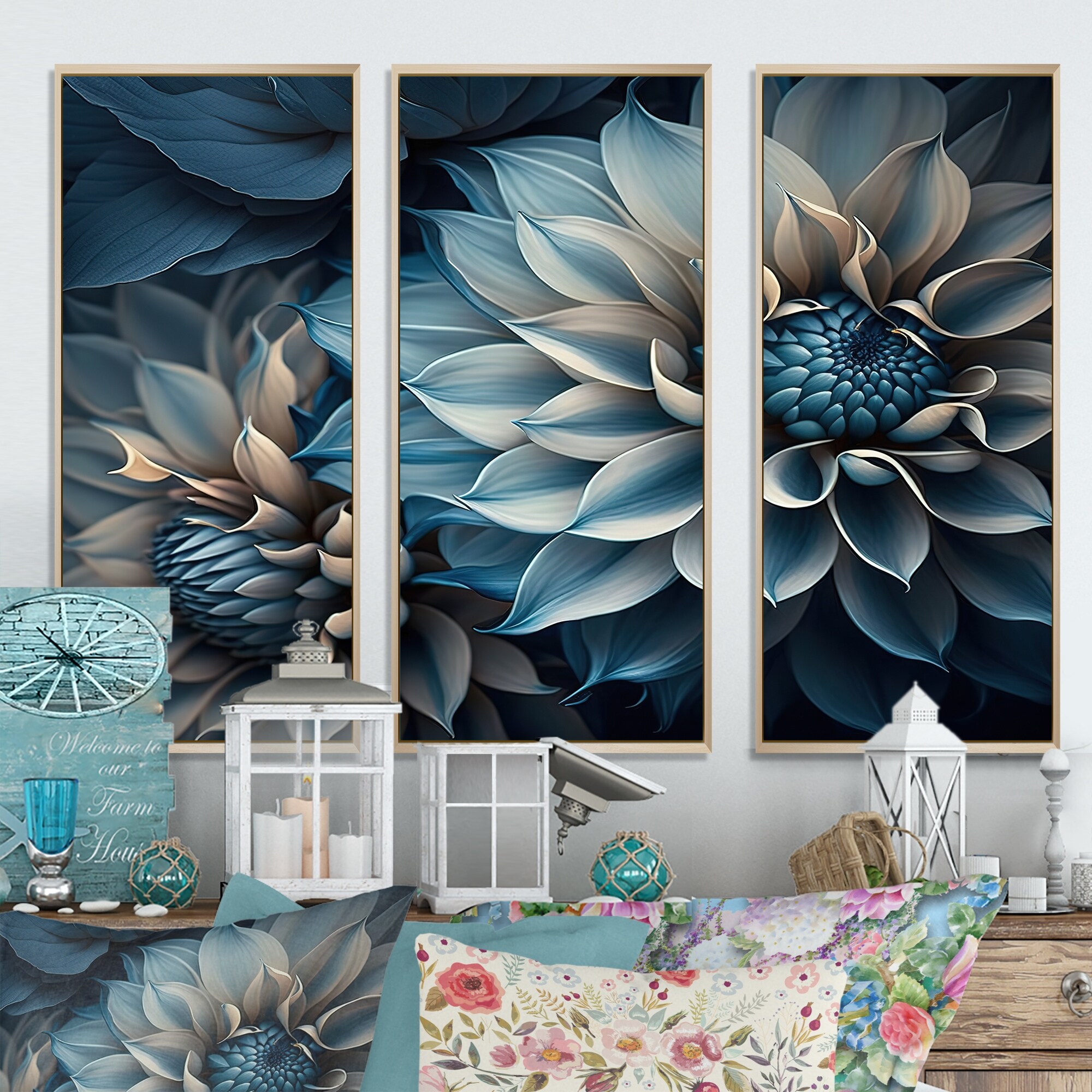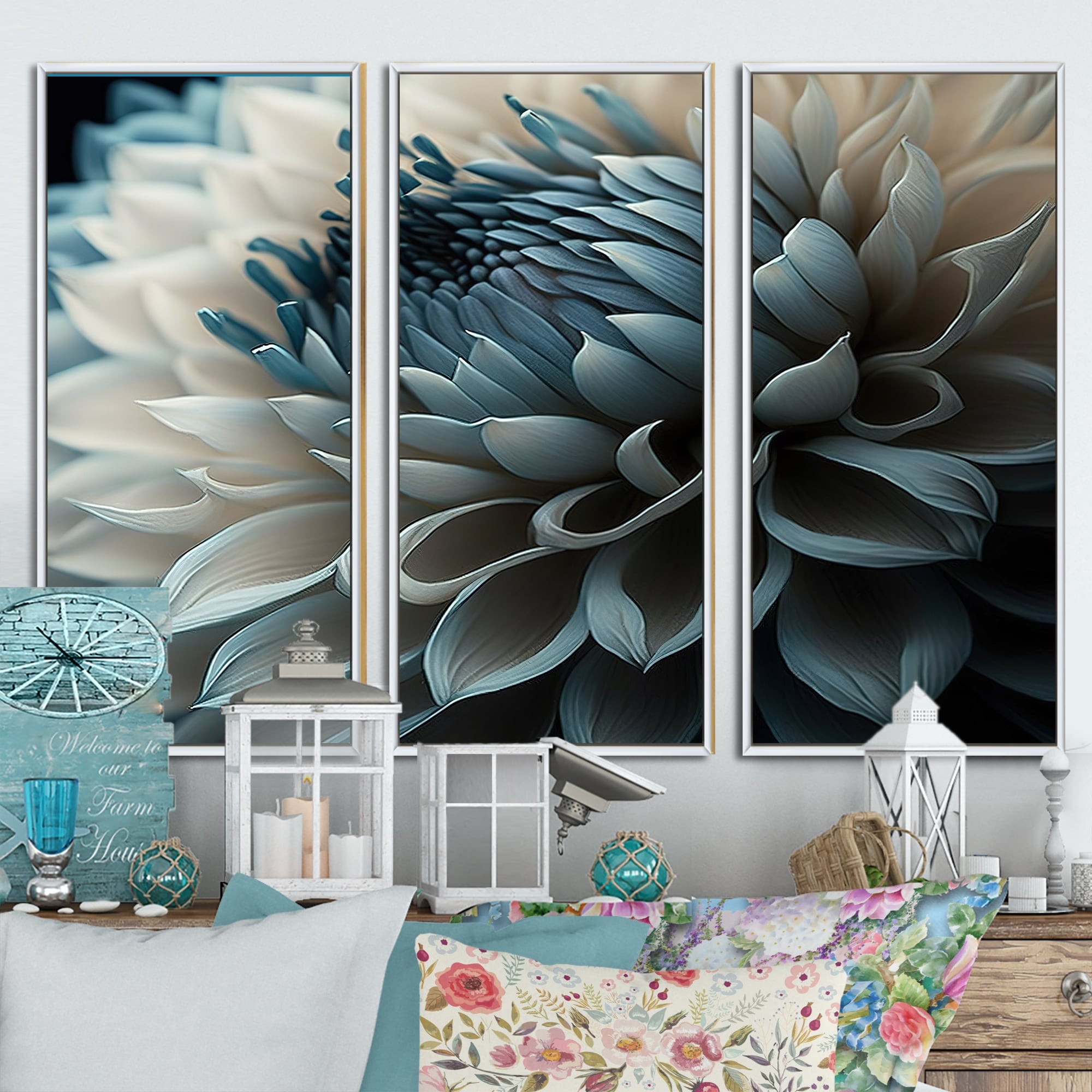Designart "Blue And White Dahlia Flowers V" Floral Dahlia Framed Canvas Art Print - 3 Panels