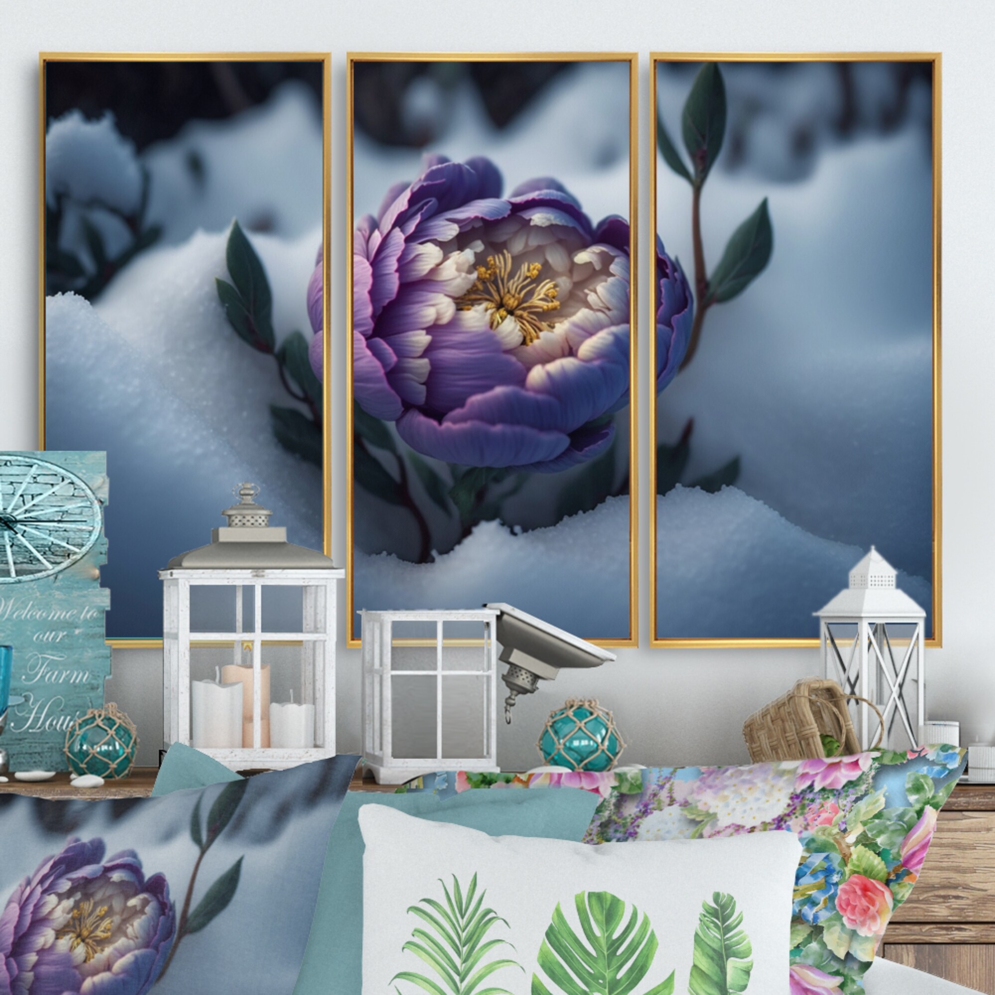 Designart "A Blooming Puple Peony Flower in Winter IV" Floral Dahlia Framed Canvas Art Print - 3 Panels