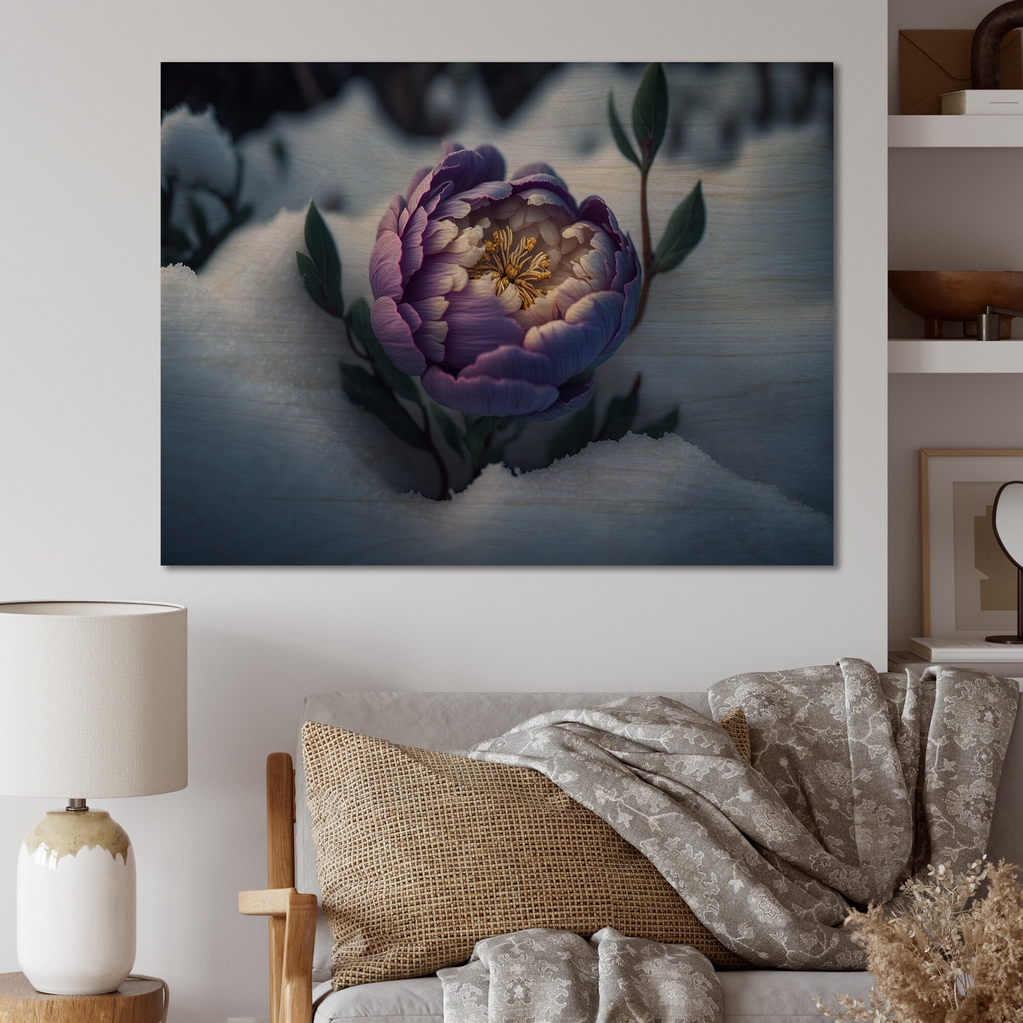 Designart 'A Blooming Puple Peony Flower in Winter IV' Floral Dahlia Wood Wall Art - Natural Pine Wood