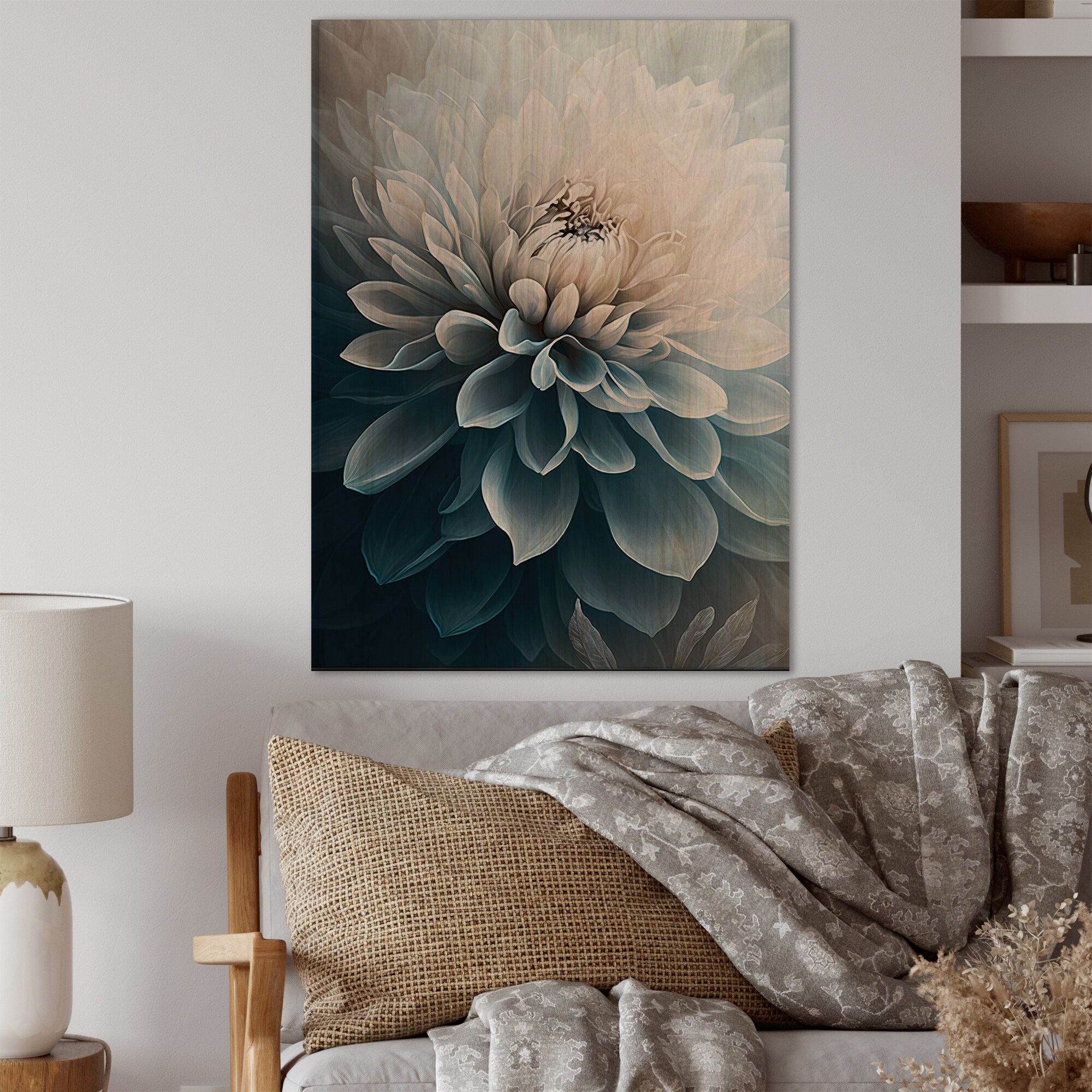 Designart 'Dahlia Flowers Blue And White I' Floral Dahlia Wood Wall Art - Natural Pine Wood