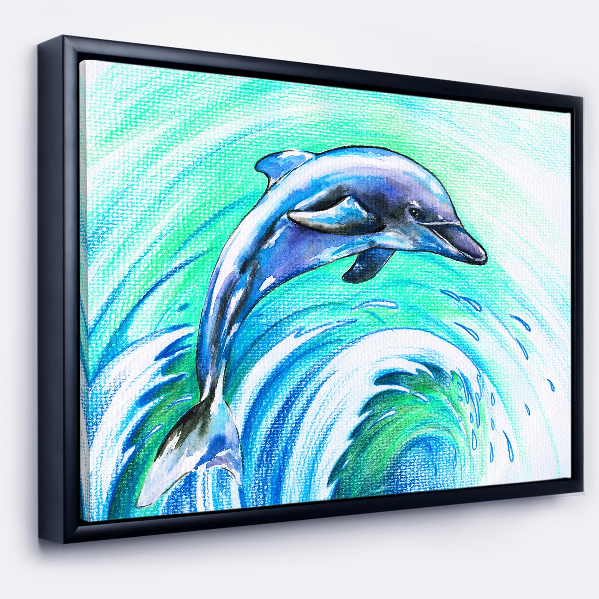 Designart "Jumping Dolphin Watercolor" Animal Framed Canvas Art Print