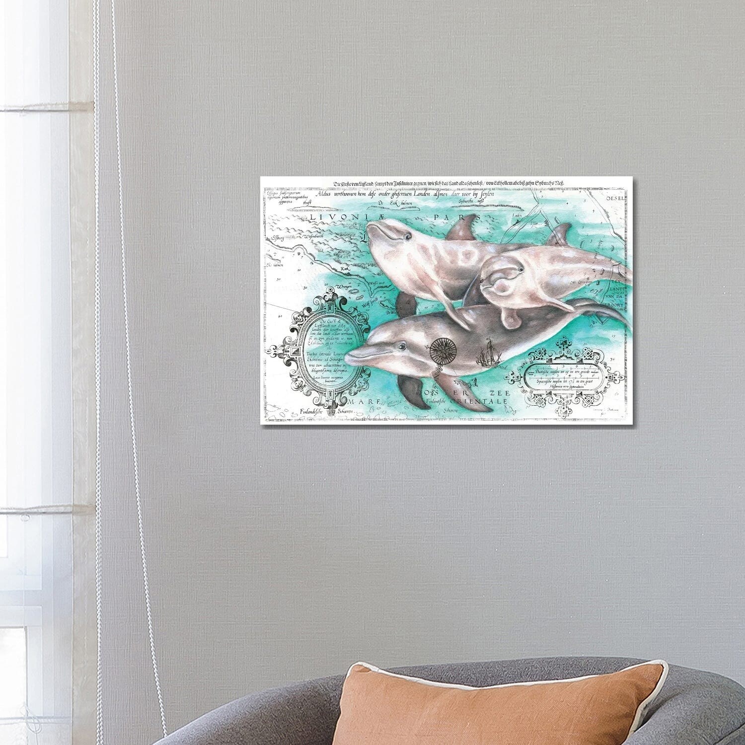 iCanvas "Cute Dolphins Family Vintage Map Teal Watercolor" by Seven Sirens Studios Canvas Print