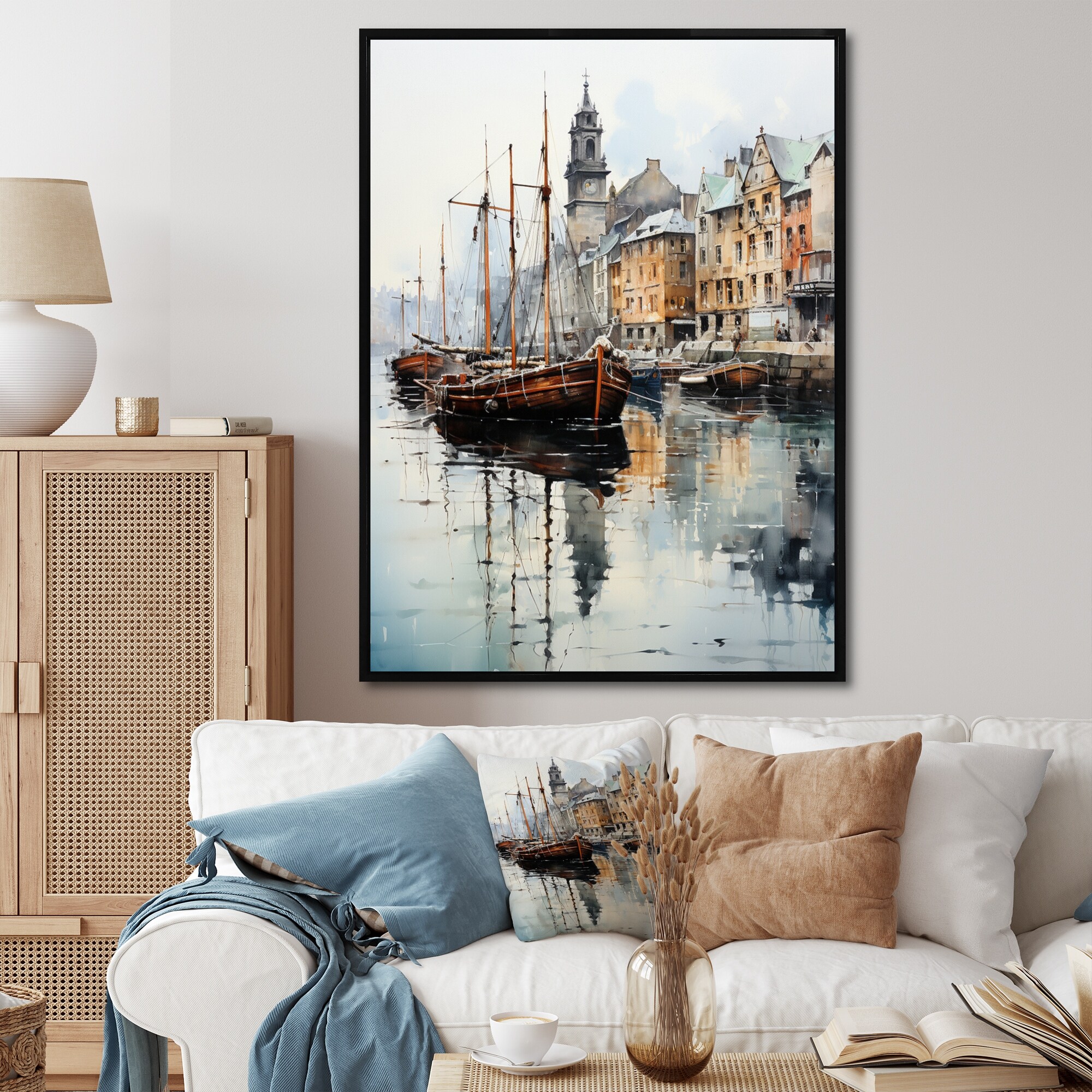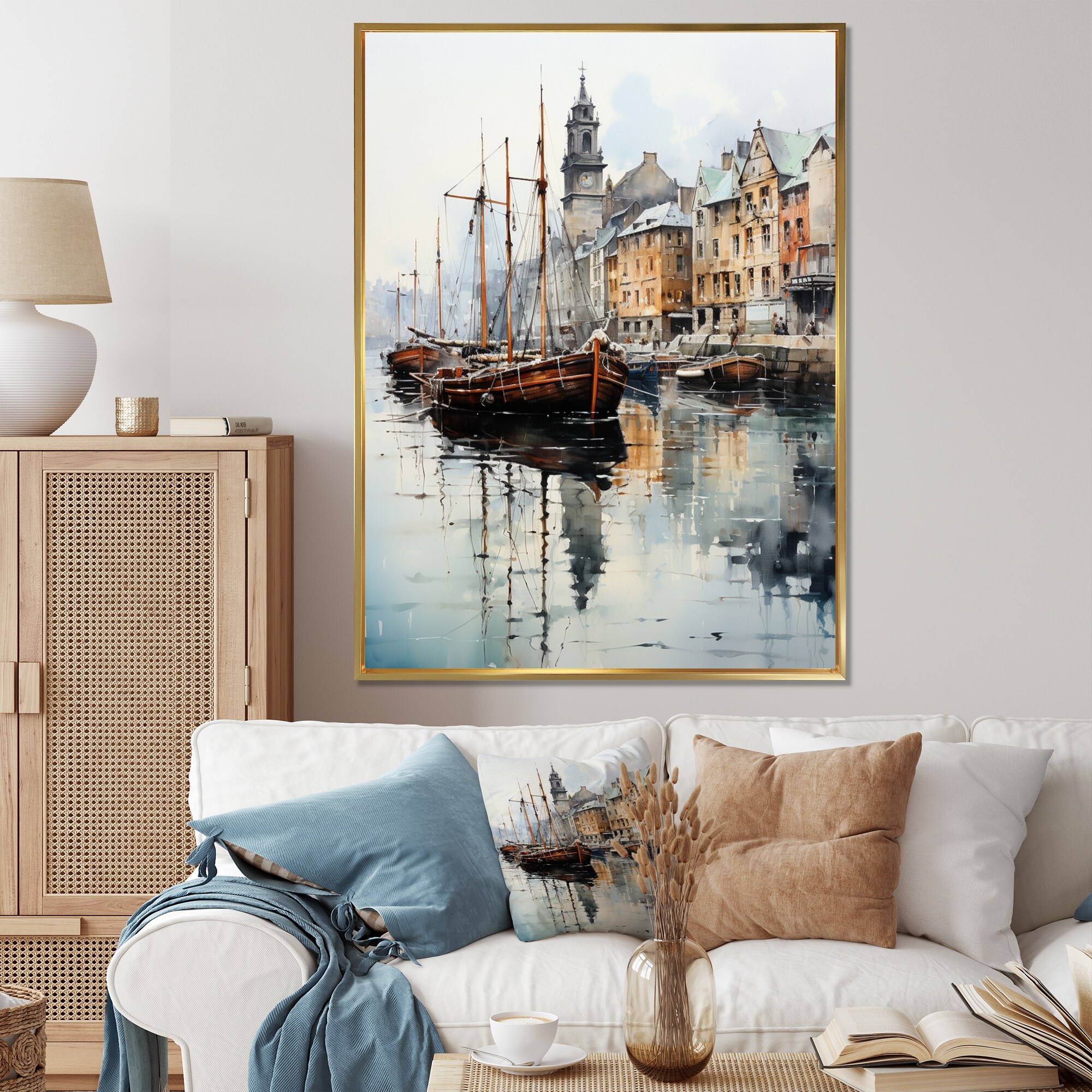 Designart "England Misty Harbor Townengland" England Framed Wall Art Prints