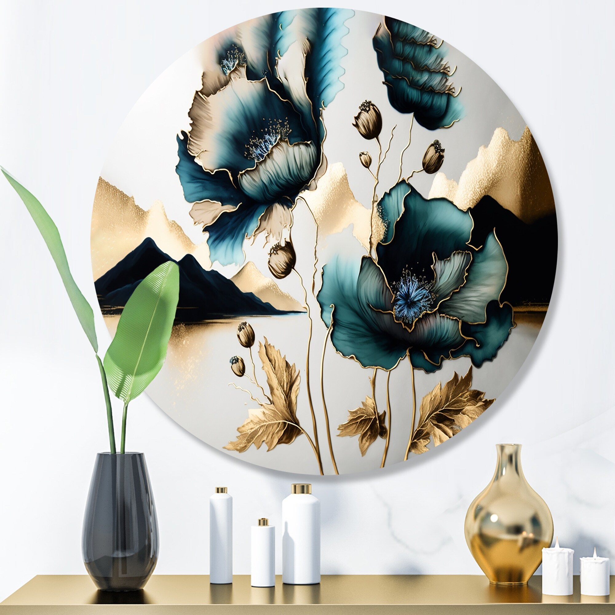 Designart "Gold And Blue Poppy Floral Euphoria" Floral Poppy Metal Round Wall Art