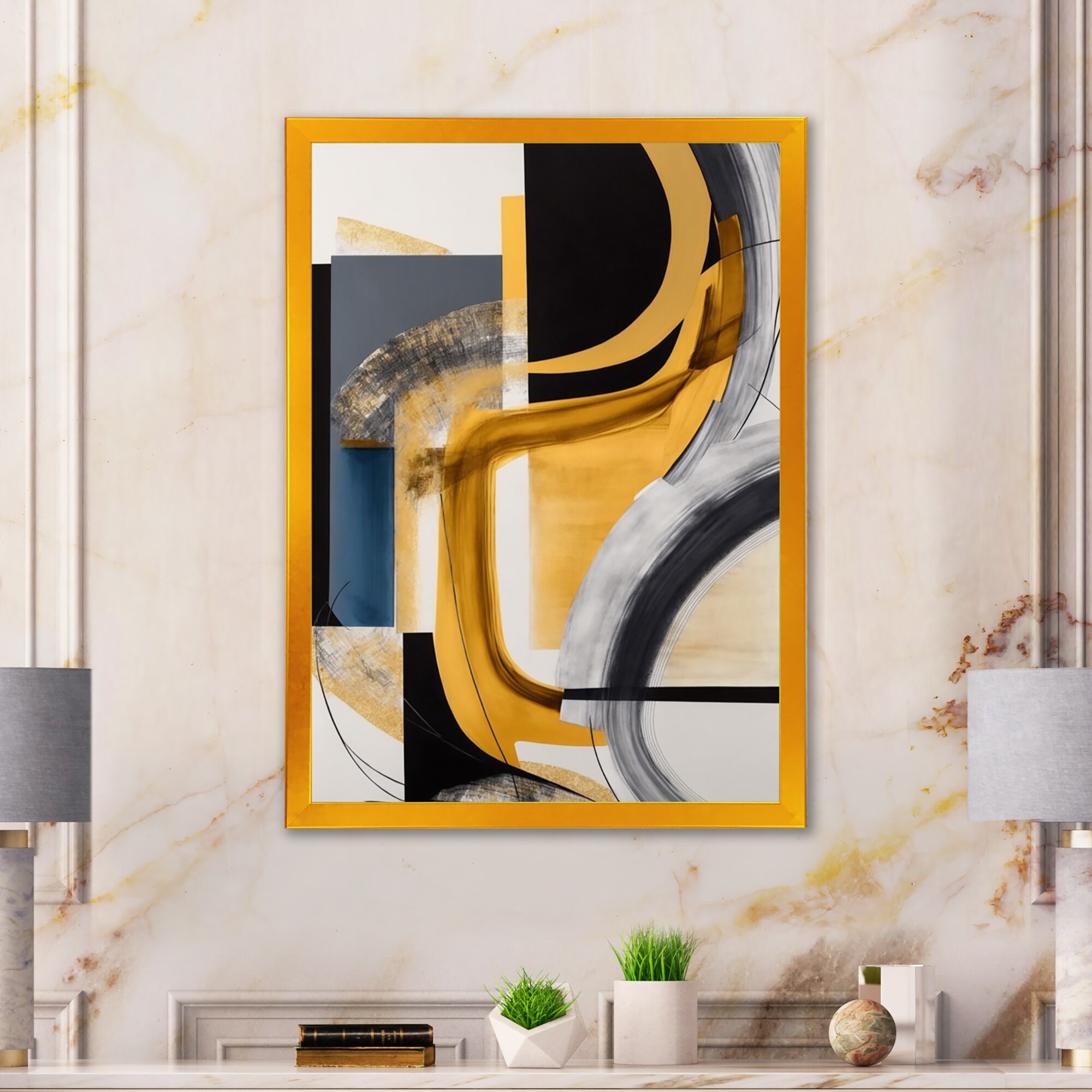 Designart "Black, White And Gold Expression III" Modern Framed Canvas Art Print