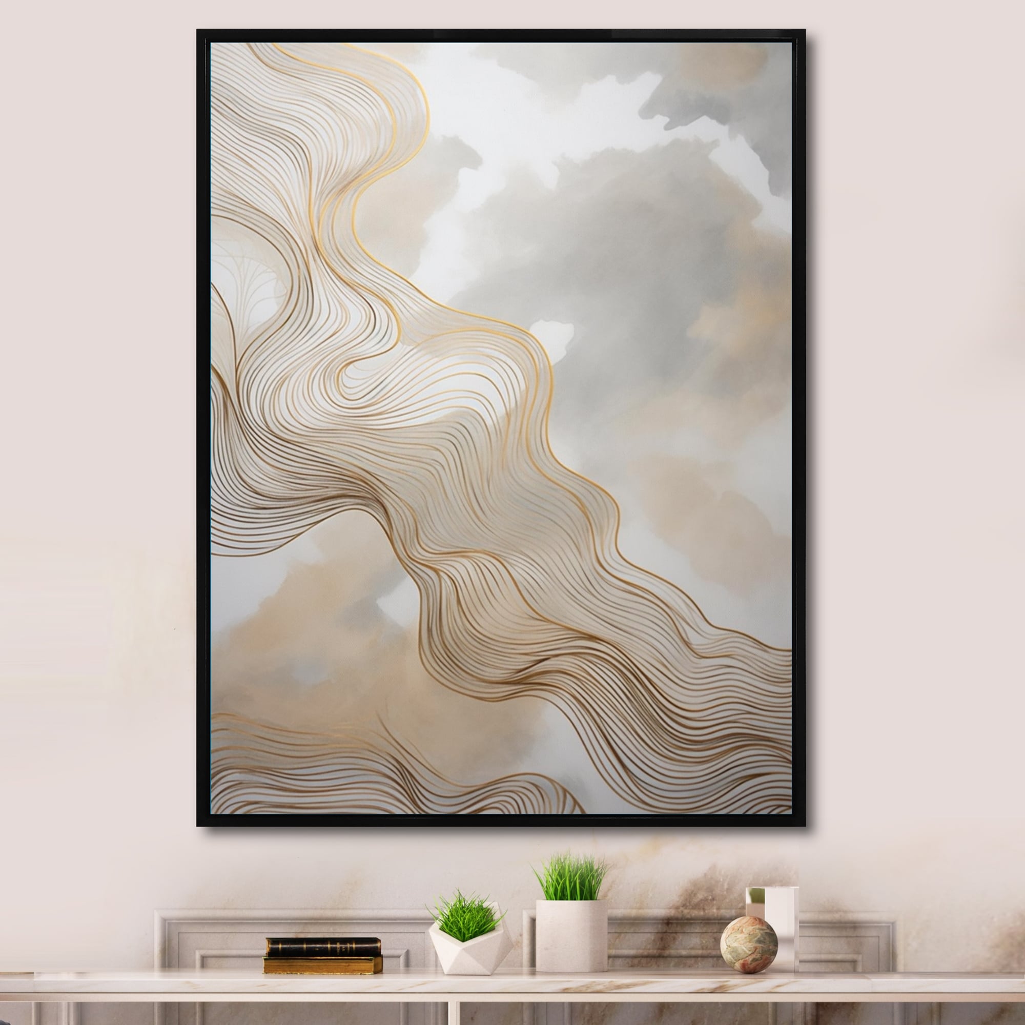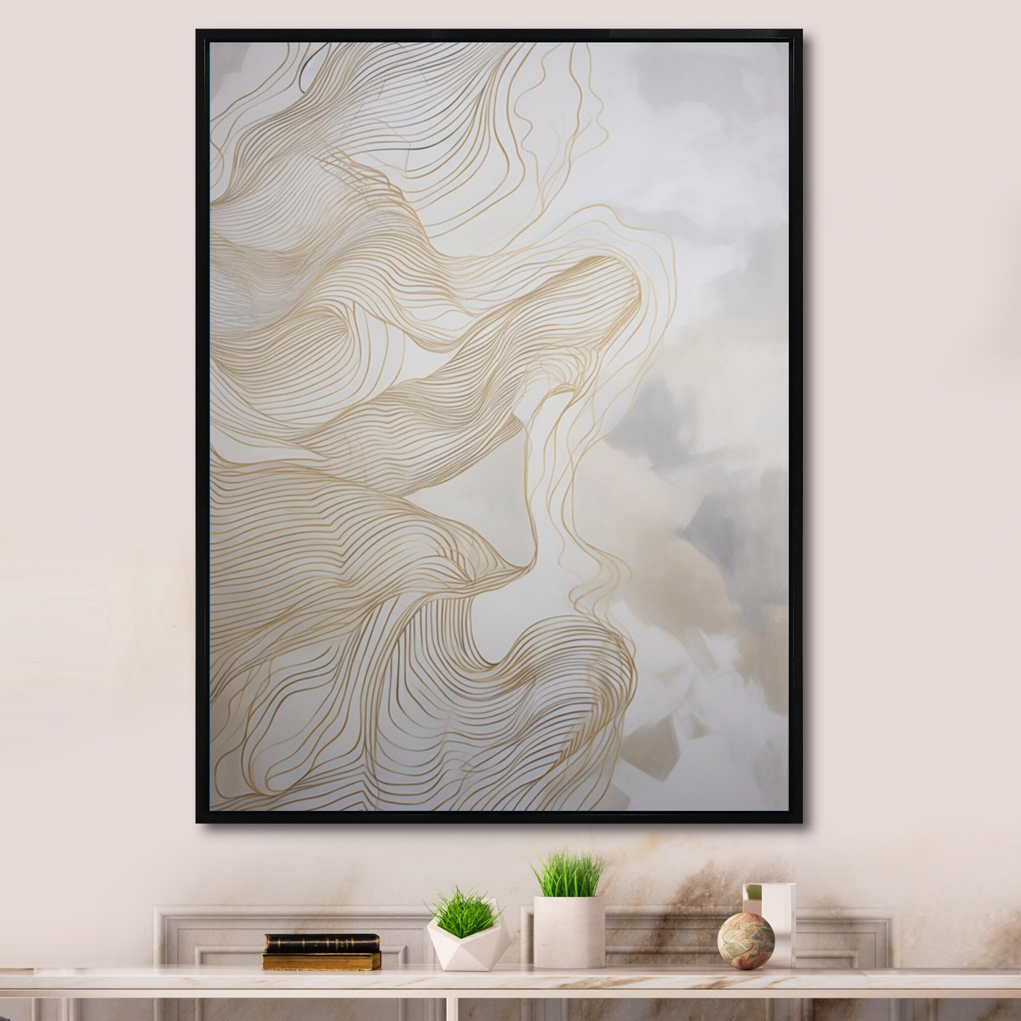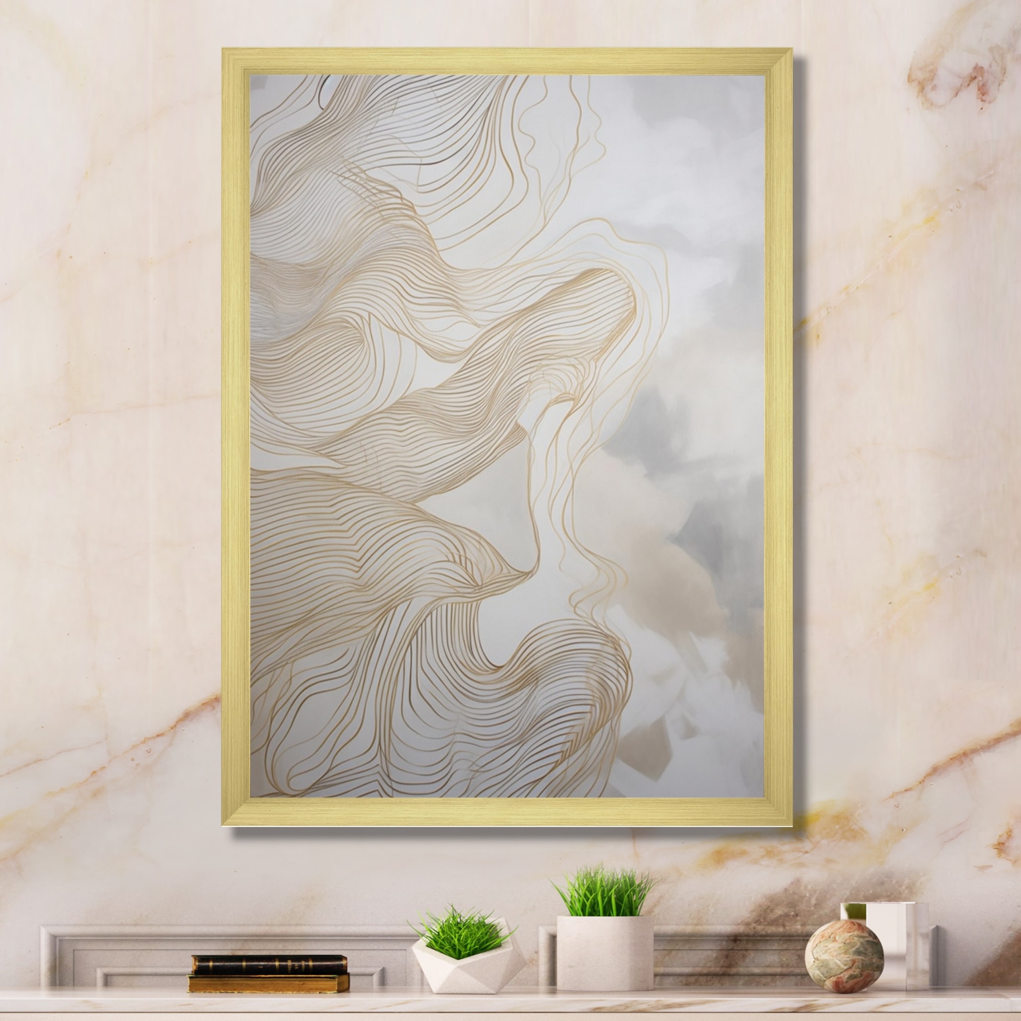 Designart "Gold And Grey Linear Expressions V" Minimalism Line Art Framed Canvas Wall Art