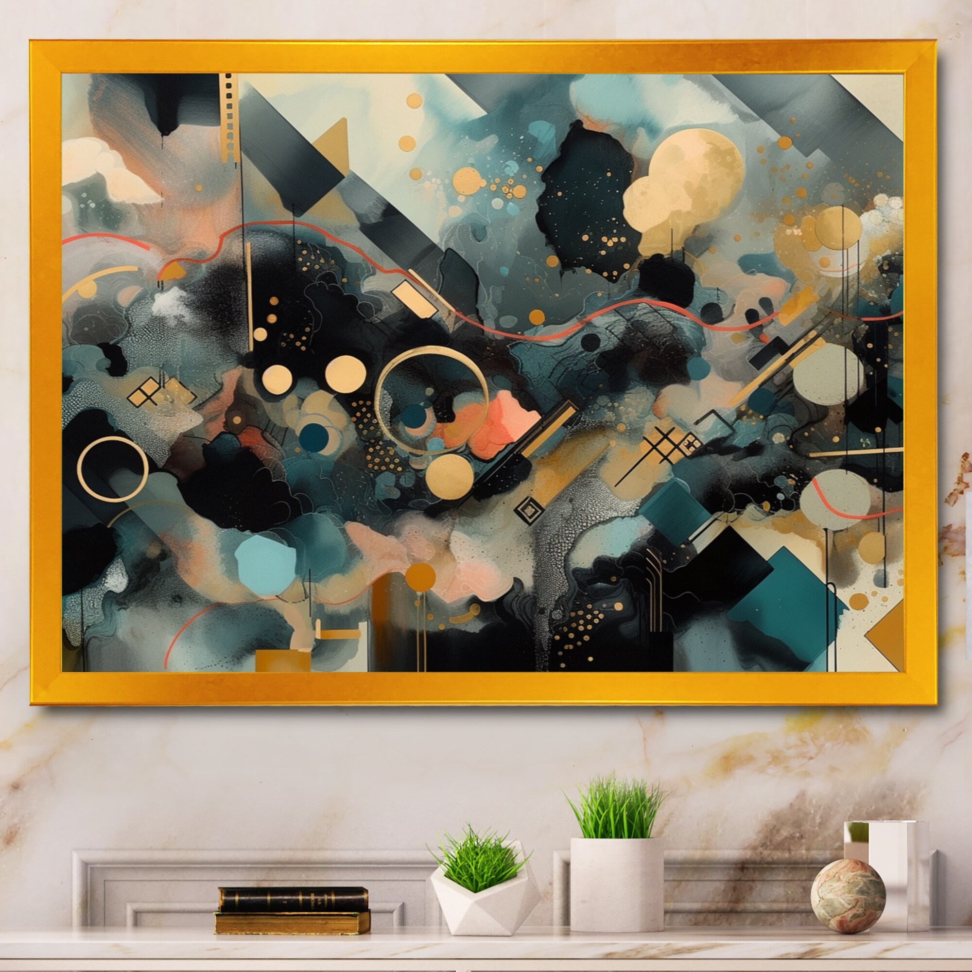 Designart "Teal And Gold Abstract Expression III" Modern Framed Canvas Art Print