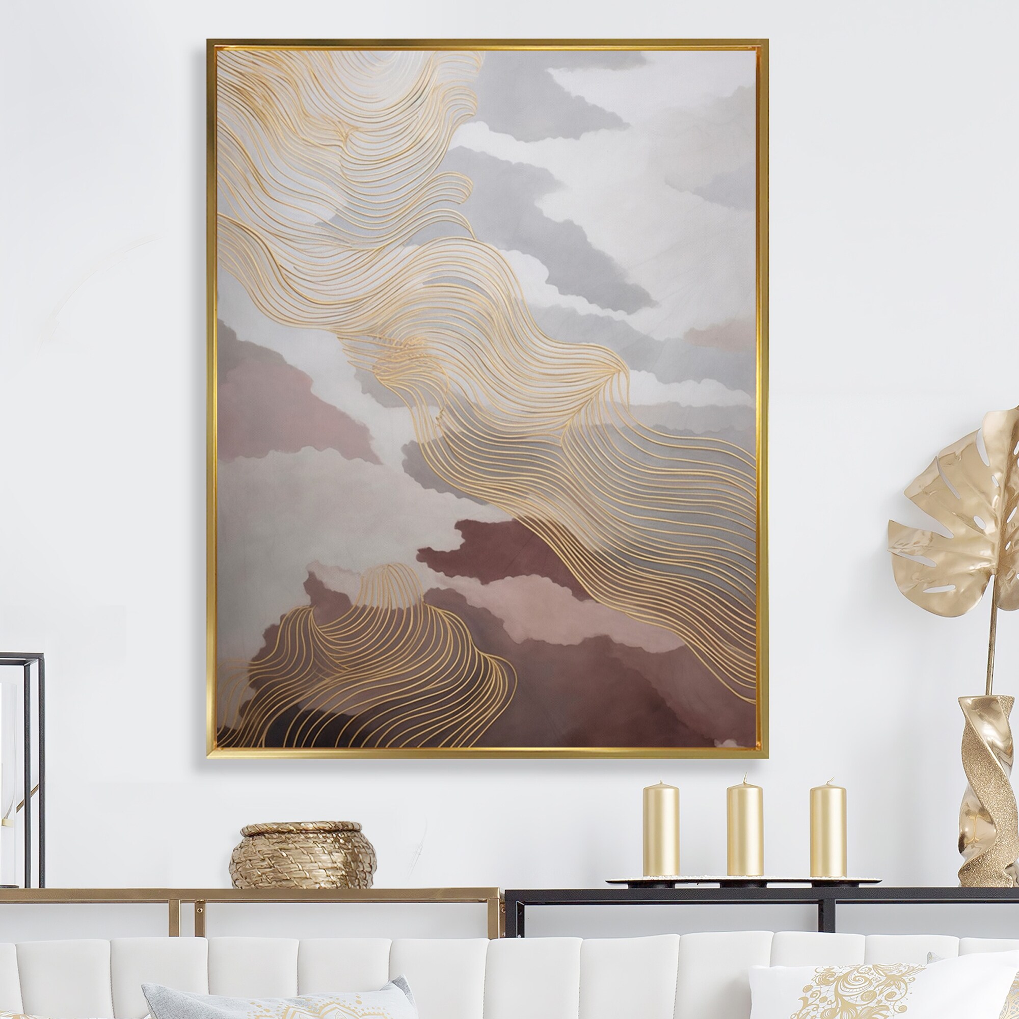 Designart "Gold And Grey Linear Expressions Iii" Minimalism Line Art Framed Wall Art for Living Room
